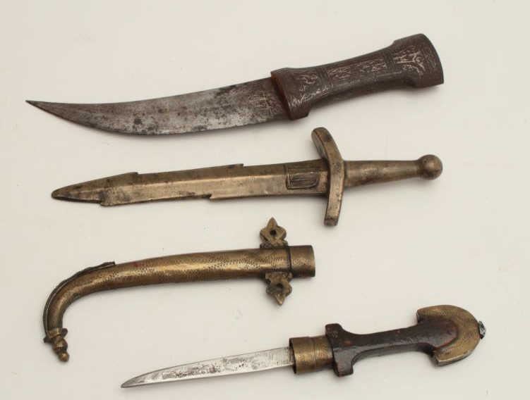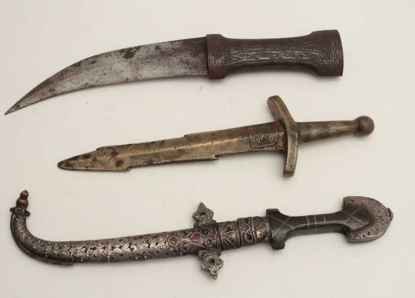 Lot of 3 items as described: 1. Childs Jambia- Mid-East to N. Africa 2. Indian silver inlaid 3. Cast “Honor Dagger” with award markings. Est.: $100-$200