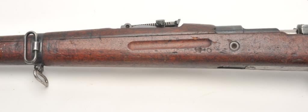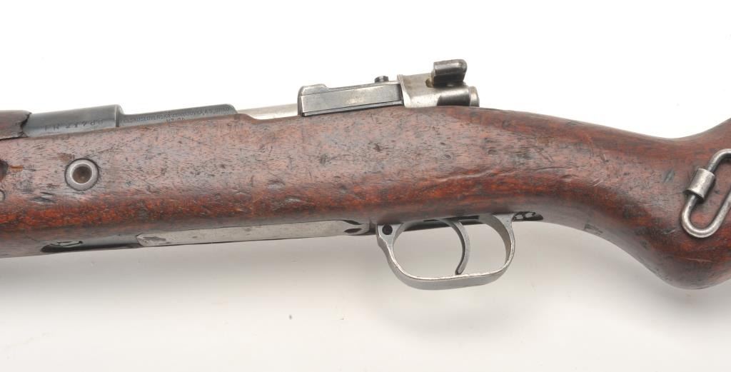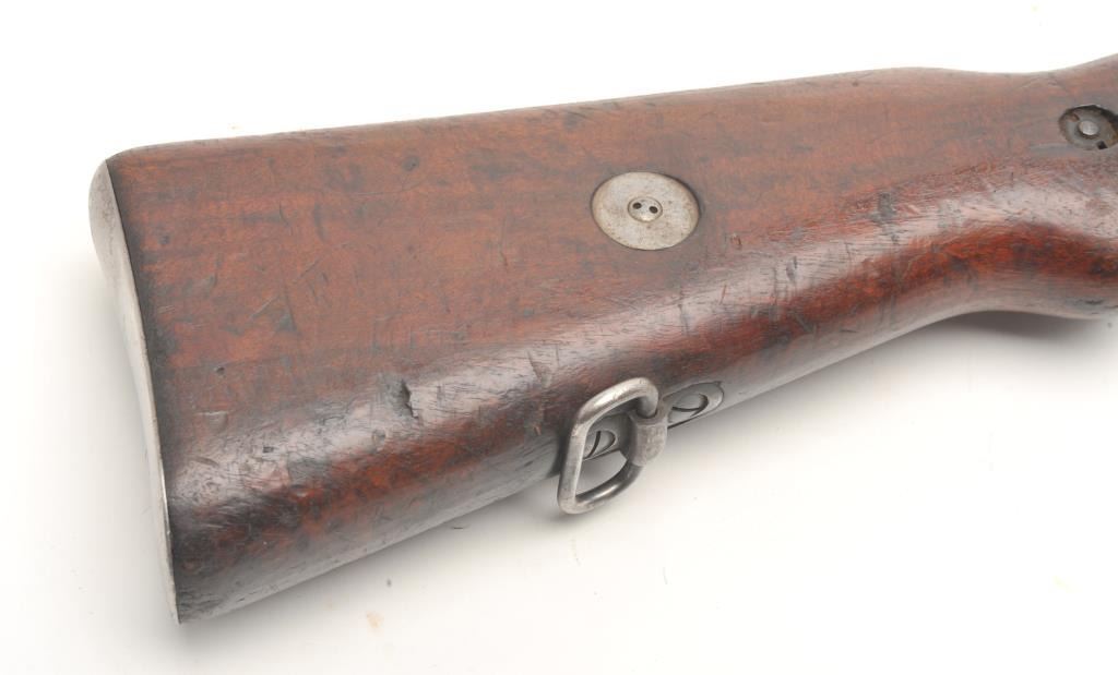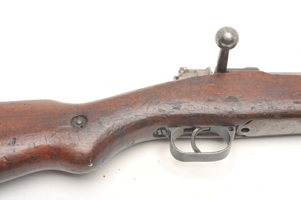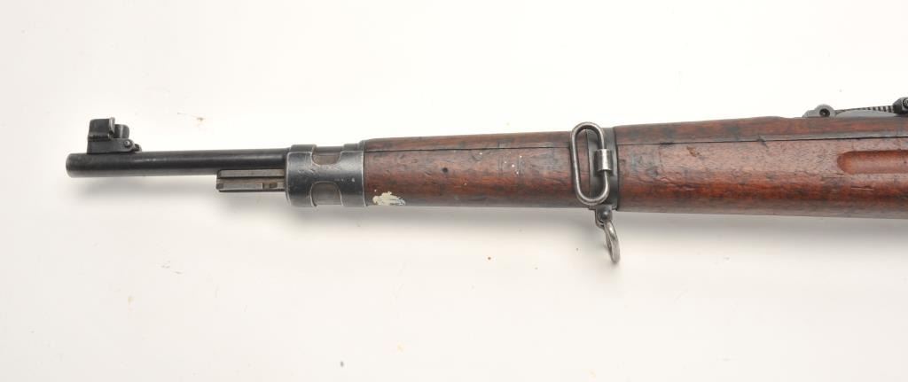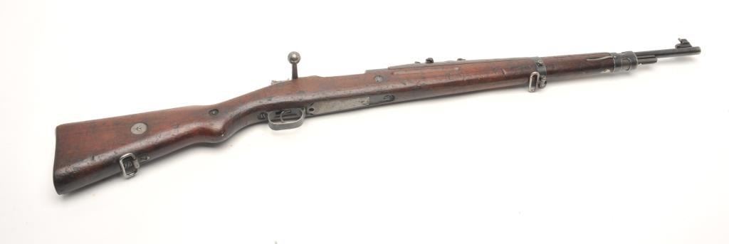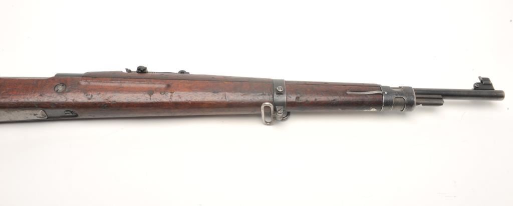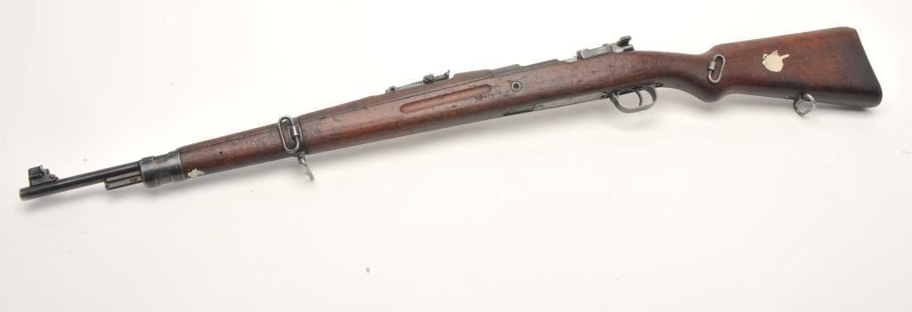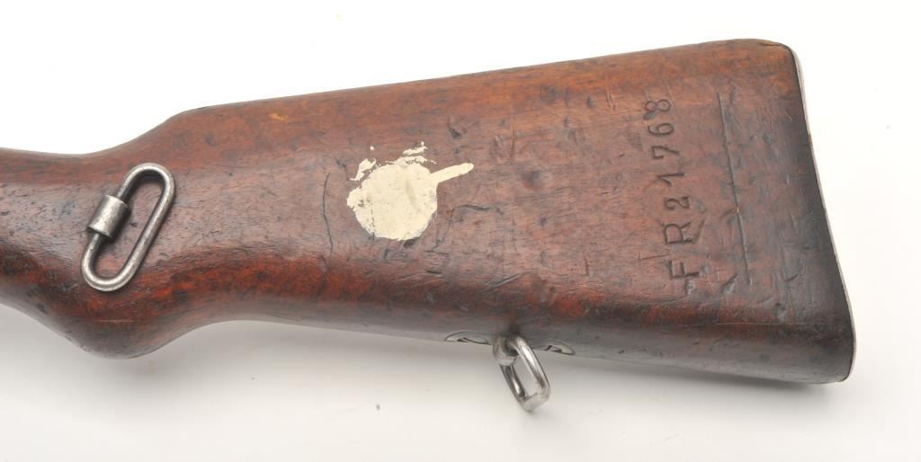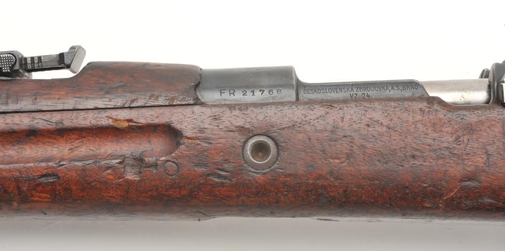 BRNO Mauser Model VZ24 bolt action rifle, 8 x 57 caliber, serial #21768. The rifle is in fair overall condition with a 24” import marked barrel featuring a ramp front and military style tangent rear sights. Thebarrel and receiver retain the majority of their original military finish moderate wear, dried oil and surface rust. The front ring has had the crest ground off. The smooth wood stock is in fair condition, showing heavyuse with significant mars and compressions. The butt ends with a smooth steel butt plate. The bore is fair, the action crisp and markings are sharp. (C+R) Est.: $250-$500.