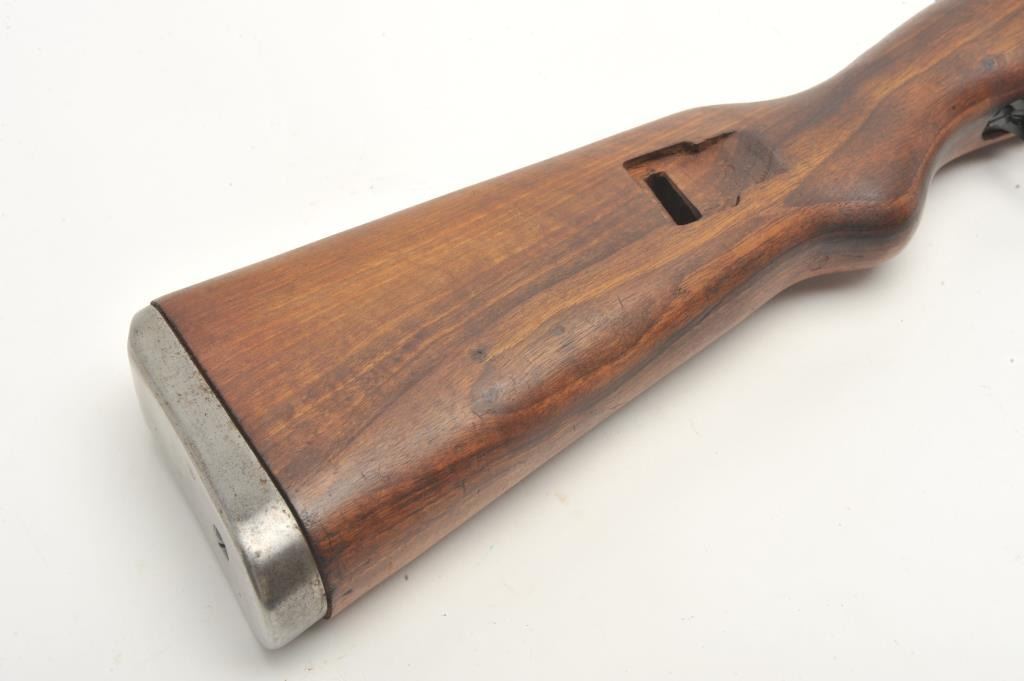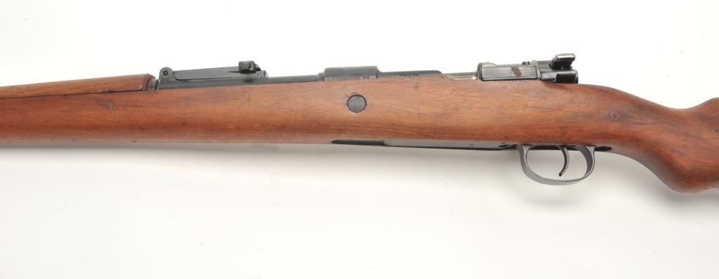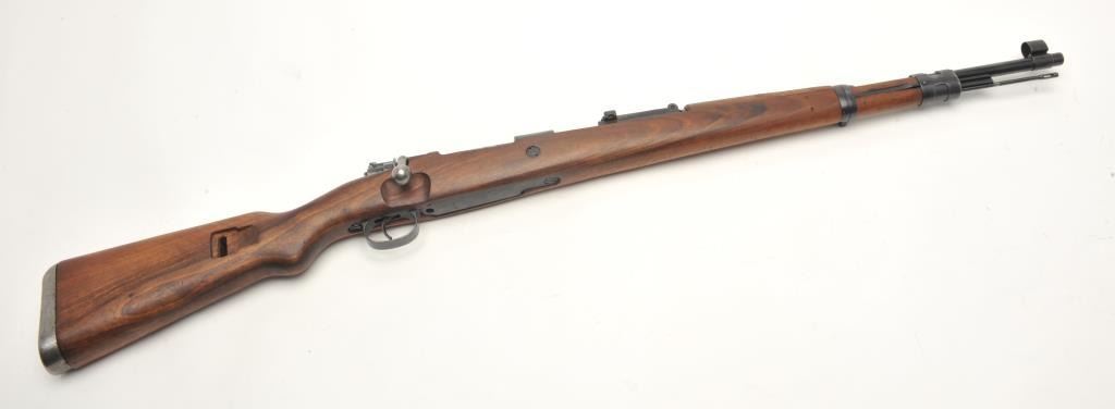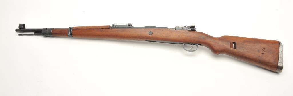 Yugoslavian Mauser Model 48A bolt action rifle, 8 x 57 caliber, serial #D632. The rifle is in very good overall condition with a 24” barrel featuring a hooded front and military style tangent rear sights. Thebarrel and receiver retain nearly all of their military finish with only storage marks. The front ring features the Yugoslavian crest. All visible serial numbers are matching on this rifle, including thebutt stock. The smooth wood stock is in very good condition showing primarily handling marks and a small cartouche behind the pistol grip. The butt ends with a smooth steel butt plate. The bore is good, the actioncrisp and markings are sharp on this desirable Mauser. (C+R) Est.: $250-$500.