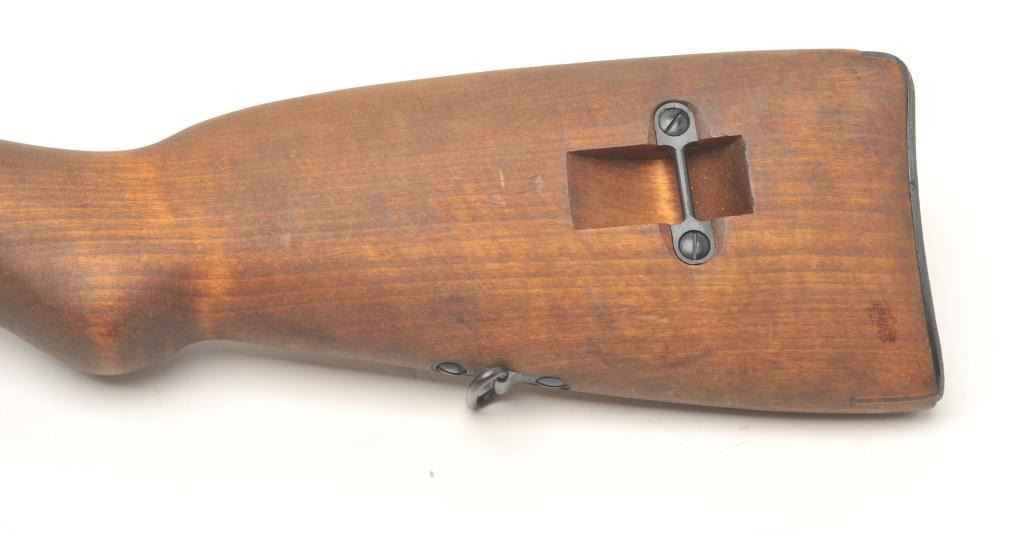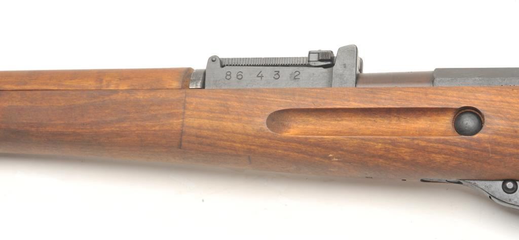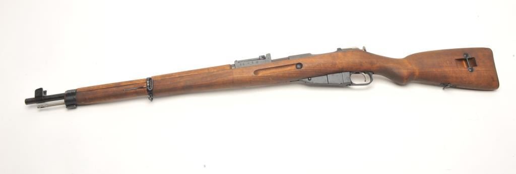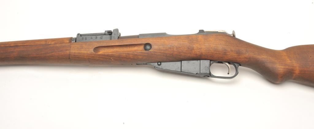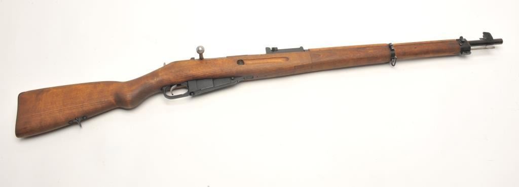 Finnish VKT Model 39 bolt action rifle, 7.62 x 54R caliber, serial #60031. The rifle is in very good condition with a 28” import marked barrel with a post front and military tangent style rear sights. The barrel andreceiver retain nearly all of their military finish with only storage marks noted. The front ring is marked VKT indicating manufacture by Valmet and is dated 1942. The smooth wood stock is in good condition withstorage marks, small compressions and round knob pistol grip. The butt ends with a smooth steel butt plate. The bore is good, the action crisp and markings are sharp. Considered the best of the Nagants, theseFinnish M39 rifles are great shooters and highly desirable. (C+R) Est.: $200-$400.
