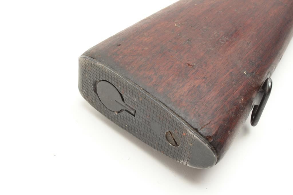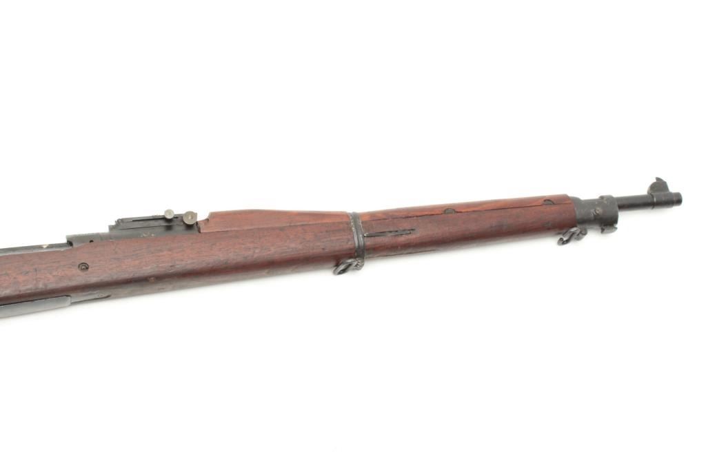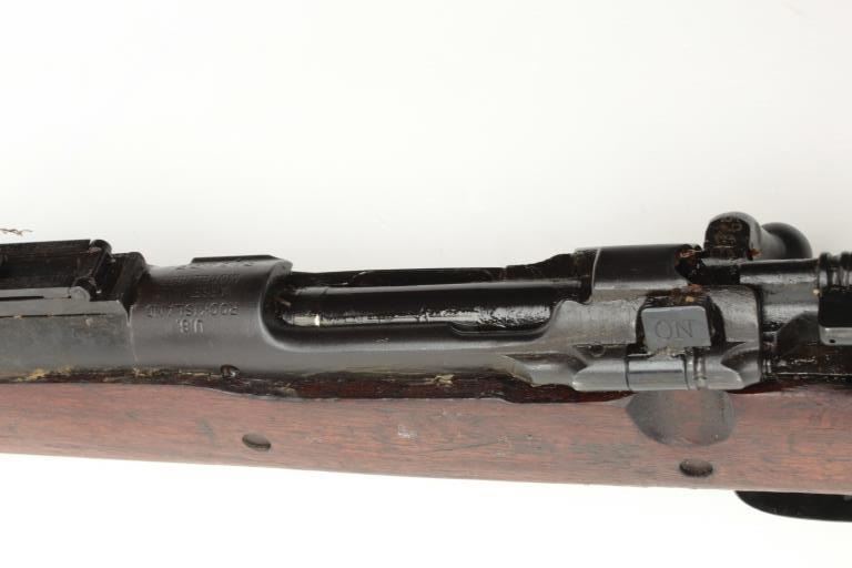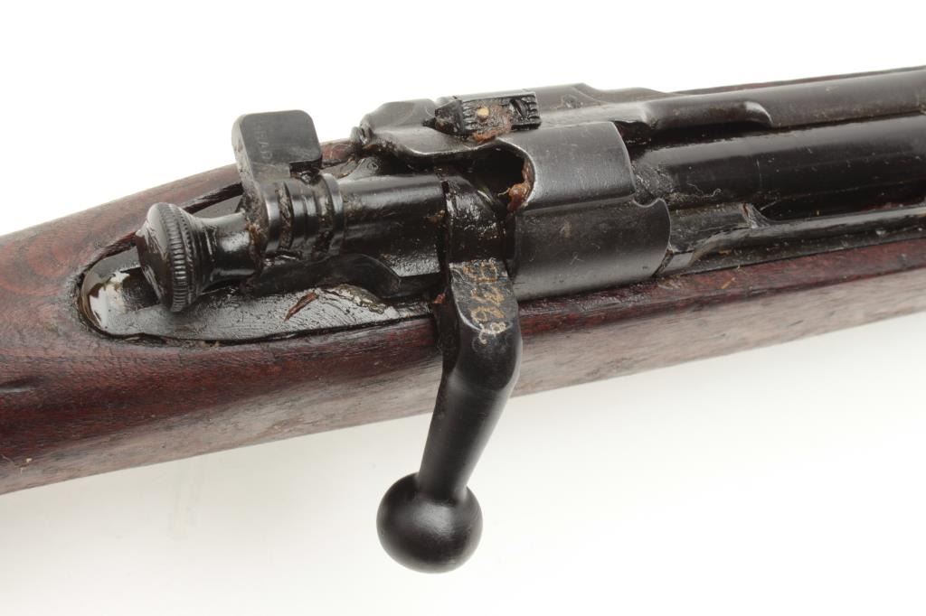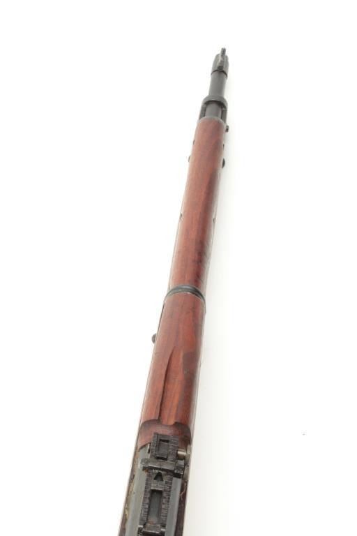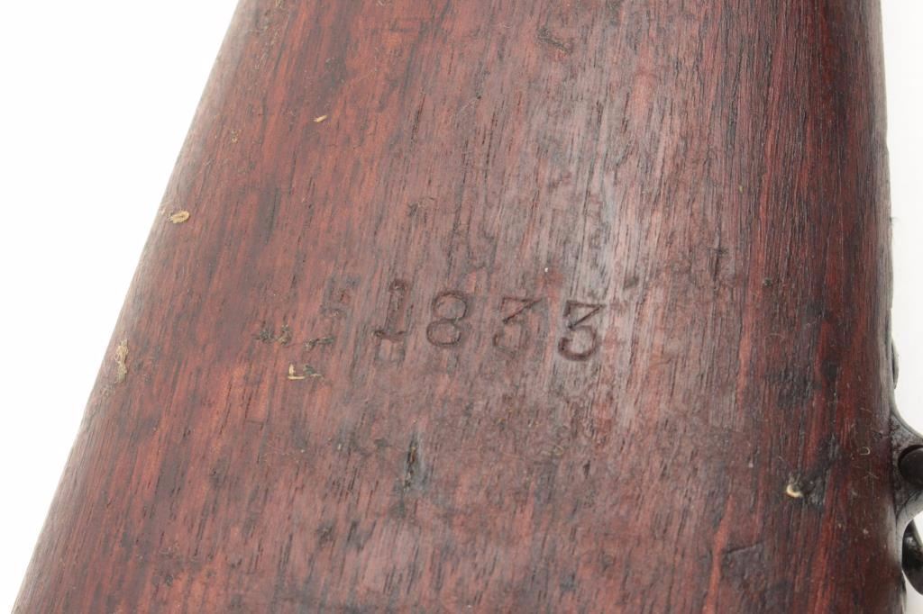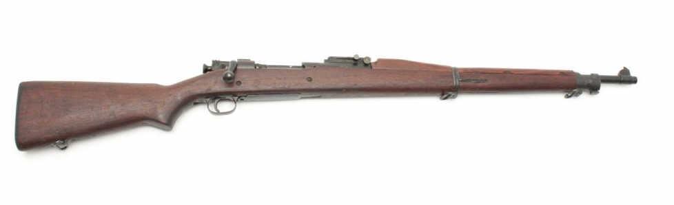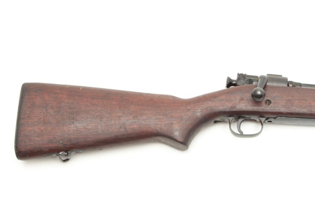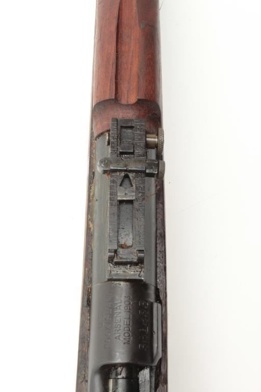 Rock Island Arsenal U.S. Model 1903 bolt action rifle, .30 caliber, serial #361833. The rifle is in very good overall condition with a 24” barrel with a blade front and military ladder style rear sights. Thebarrel and receiver retain the majority of their military finish with significant residual packing grease evident. The barrel is Springfield marked and is dated 7-42 with the flaming bomb emblem. The smooth woodstock shows storage marks and extra grease and is serialized to the action. The stock includes sling swivels and ends with a checkered steel butt plate with trap. The bore is fair, the action is crisp andmarkings are sharp. (C+R) Est.: $400-$800