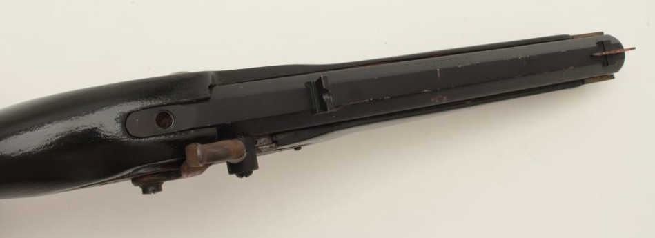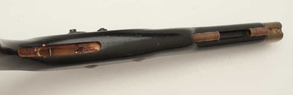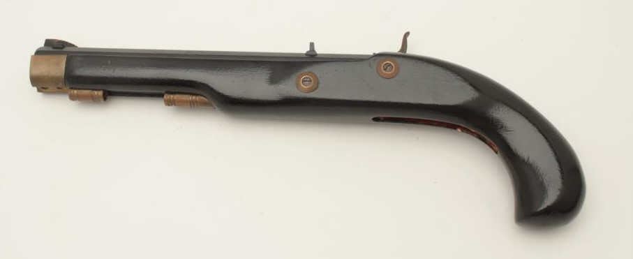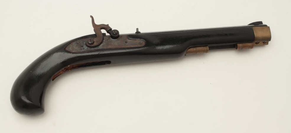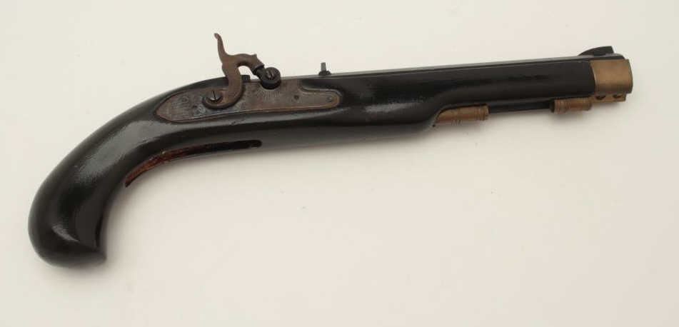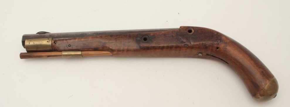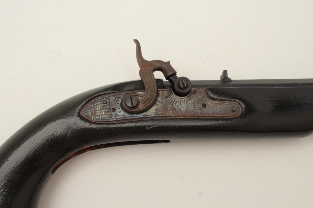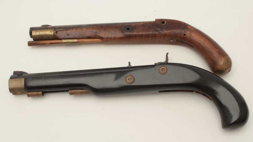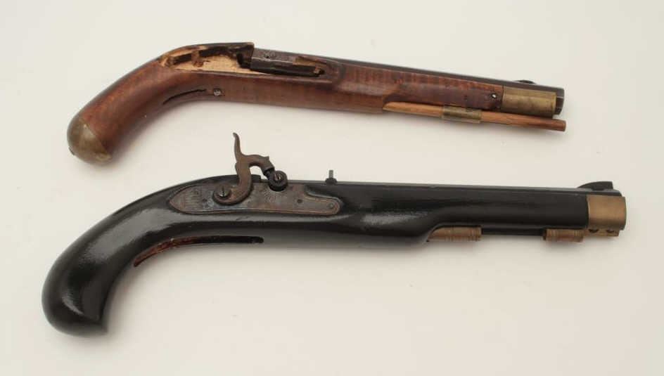 Lot of two Kentucky pistols. One is an original antique which is missing the lock with 9 ½” octagon barrel of approximately .44 caliber, wood stock and brass hardware all in fair overall condition. The second is areproduction with a 10” octagon barrel of approximately .45 caliber, smooth wood stock and brass hardware all in good overall condition. Est.: $200-$400.