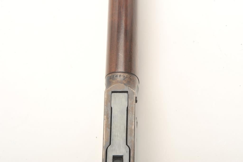 Winchester Model 1894 lever action carbine, .30 Win. caliber, serial #2848915. The carbine is in fair overall condition. The 20” round barrel and full-length magazine retain the majority of their blued finish.The receiver shows considerable flaking of finish with surface rust and a social security # written in electric pencil. The smooth wood stocks are in good condition with small mars, compressions and slight loss offinish. The butt stock ends with a checkered steel butt. The bore is fair, action functions and markings are legible. A post 64 Winchester that has suffered from poor storage. (C+R) Est.: $150-$300.