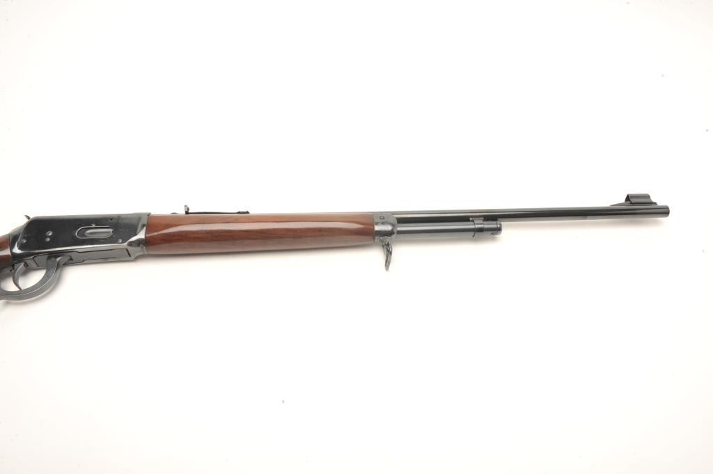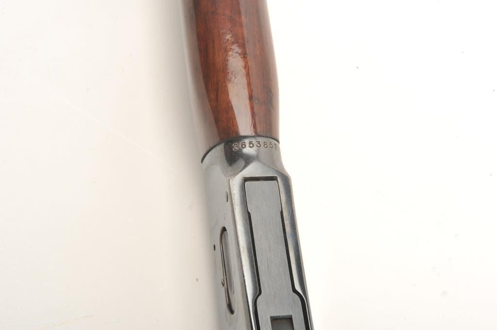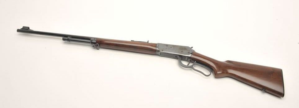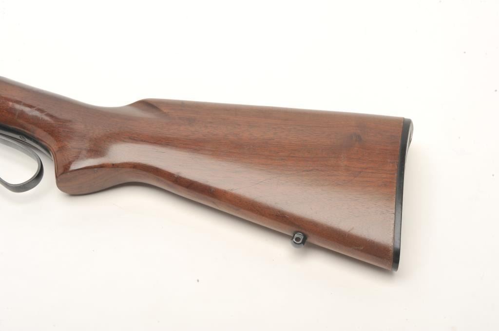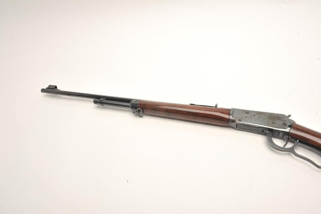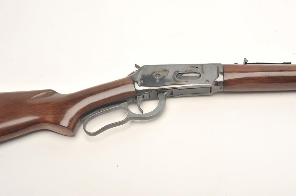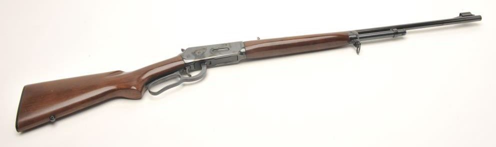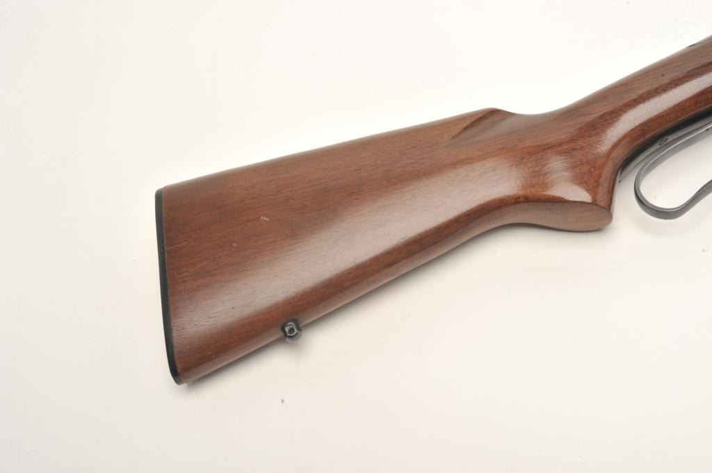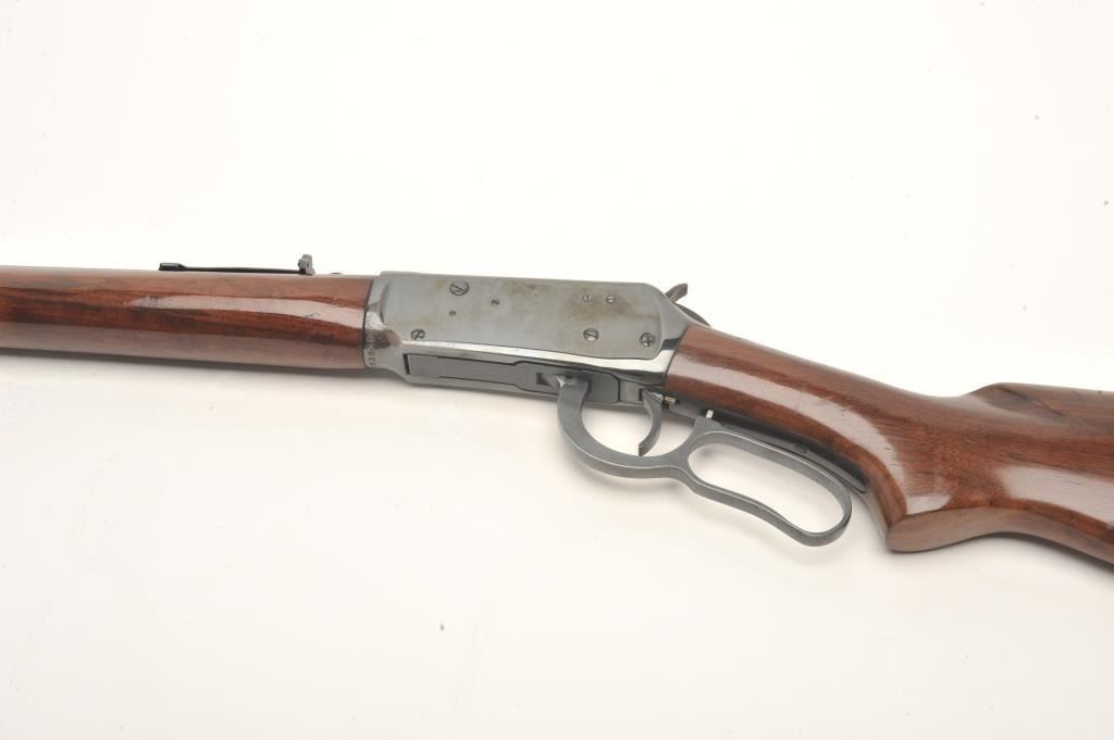 Winchester Model 64A lever action rifle, .30WCF caliber, serial #3653857. The carbine is in good overall condition as re-finished. The 24” round barrel and 1/2 magazine retain the majority of an old re-bluedfinish. The receiver also retains a significant amount of an old re-blue with small mars, extra holes drilled and tapped for a side mount and rust evident on the tang. The smooth wood stocks are in goodcondition with small compressions, an extra coat of varnish and a checkered plastic butt plate. The bore is good, the action crisp and markings are legible. (C+R) Est.: $250-$500.