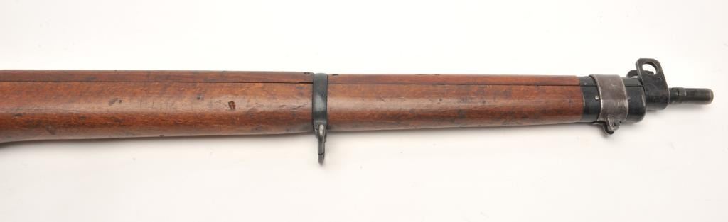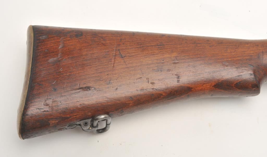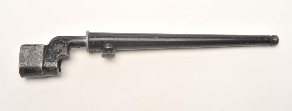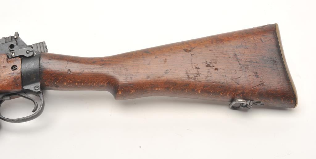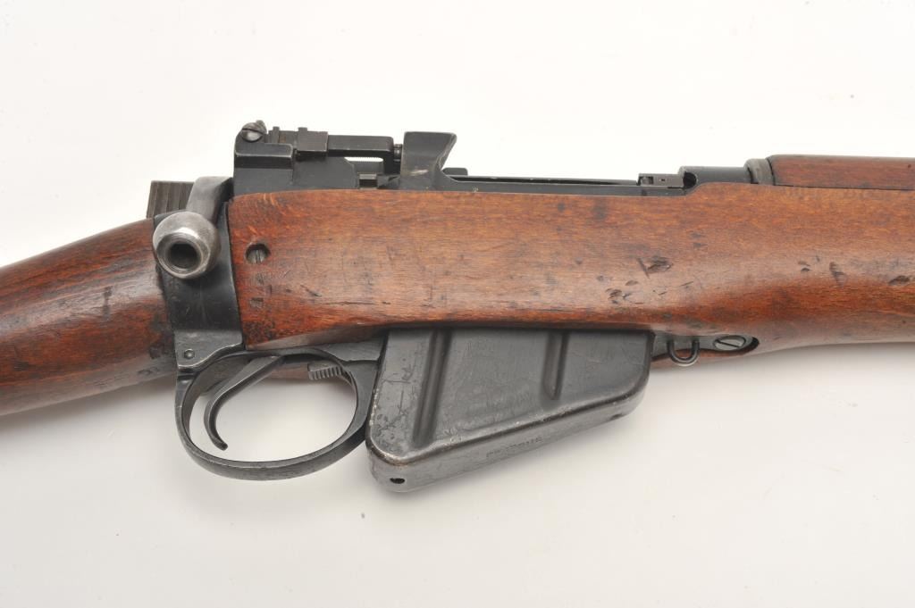 Lee- Enfield No.4 Mk. 2 bolt action rifle, .303 British caliber, serial #PF121204. The rifle is in good overall condition showing moderate service use. The rifle features a 25” barrel with a ramp front and ladder rearsights. The barrel and action retain the majority of their military blacked finish with wear at the muzzle and small mars. The action is dated 7/49. The smooth wood stocks are in good condition showing moderate wearwith compressions and dents. The serial number is marked under the fore end. The butt stock includes sling swivels and ends with a smooth brass butt plate with trap. The bore is fair, the action crisp and markings aresharp. The lot includes a Lee-Enfield bayonet still wrapped in paper. (C+R) Est.: $200-$400.