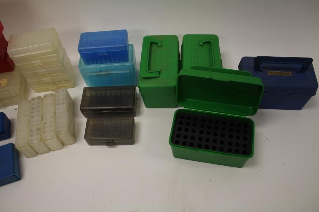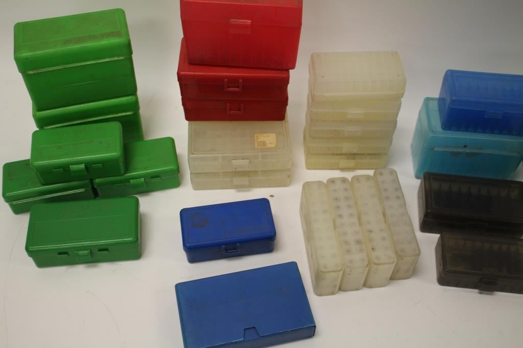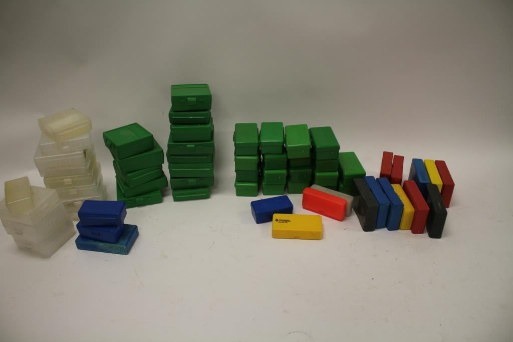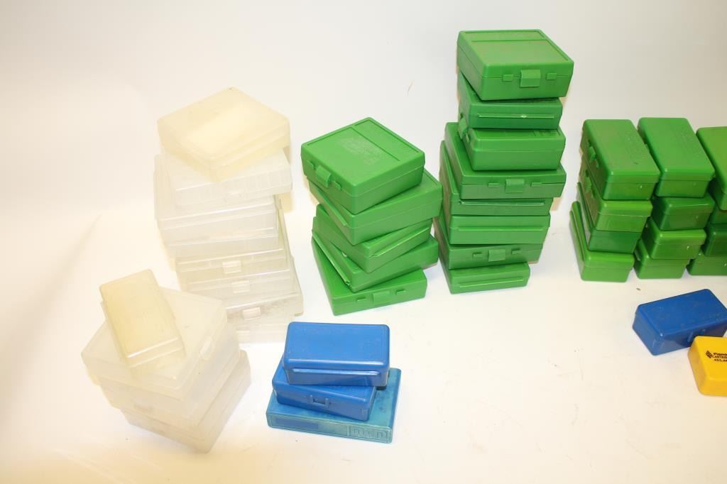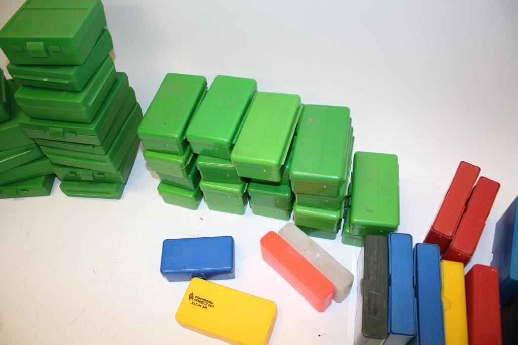 Reloaders lot of empty plastic ammo boxes for both rifle and pistol; 20, 50 & 100 count boxes; over 100 total! Est.: $100-$200.