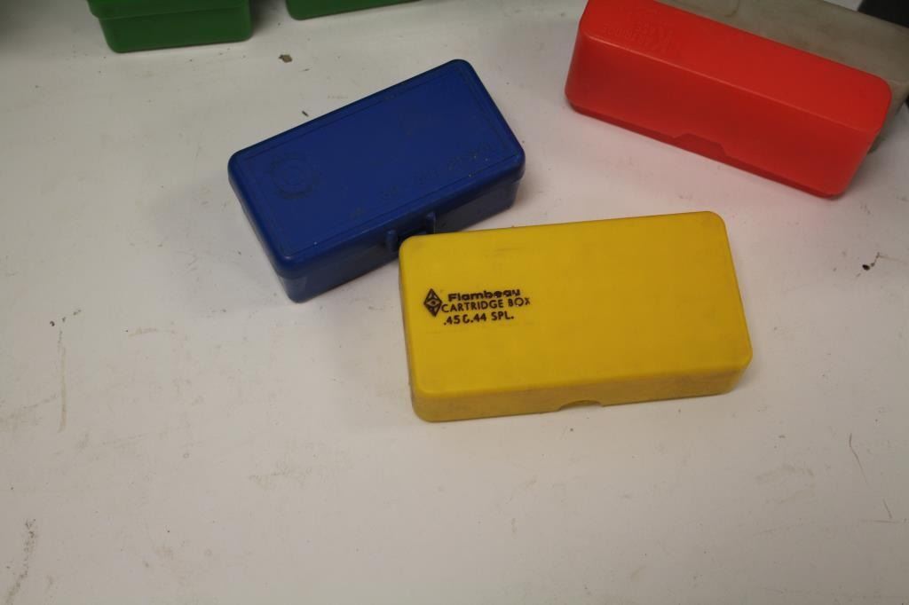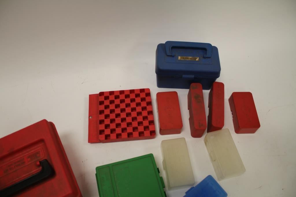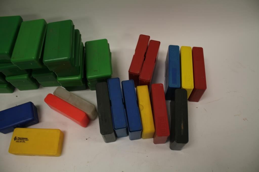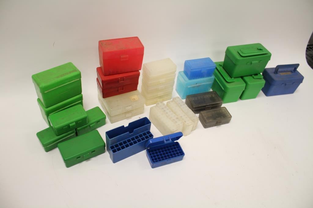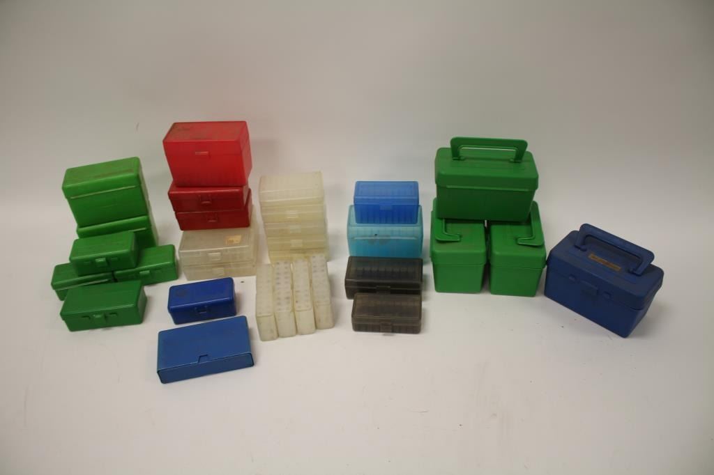 Reloaders lot of empty plastic ammo boxes for both rifle and pistol; 20, 50 & 100 count boxes; over 100 total! Est.: $100-$200.