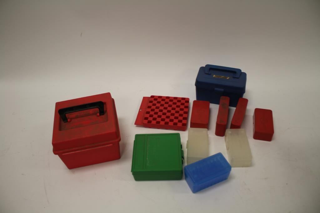Lot 2026 Reloaders lot of empty plastic ammo boxes for both rifle and pistol; 20, 50 & 100 count boxes; ove