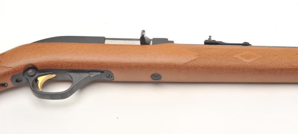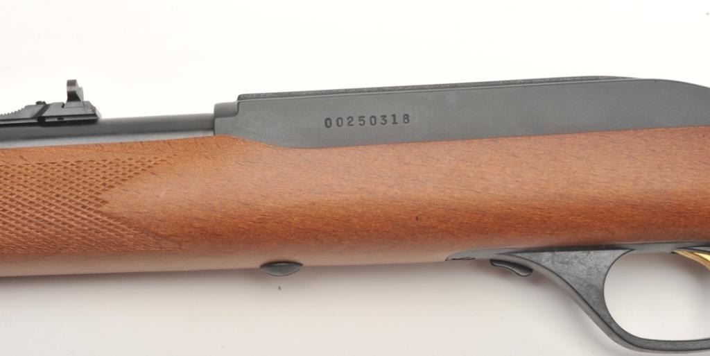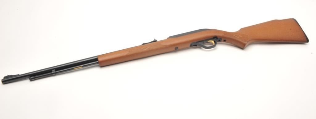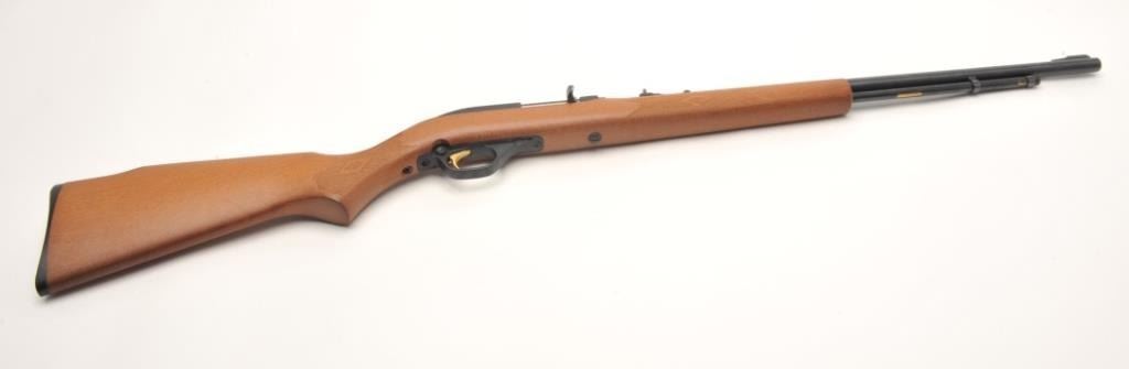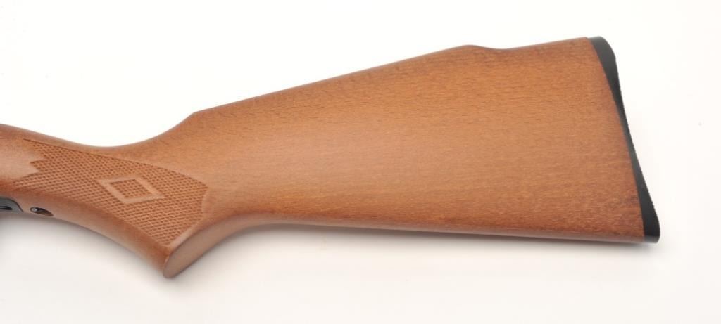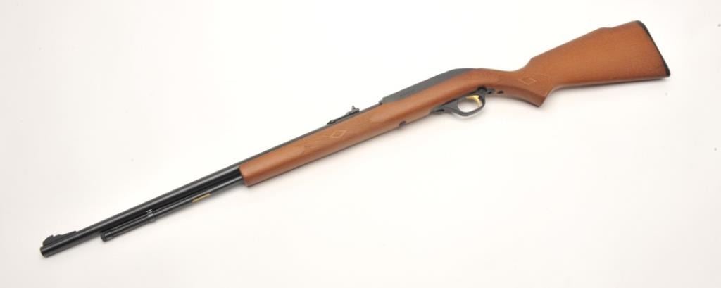 Marlin Model 60 semi-auto rifle, .22 L.R. caliber, serial #00250318. The rifle is in as new condition with a 22” round barrel. The barrel, magazine and receiver retain the majority of their blued finish with onlyminor handling marks noted. The checkered wood stock is in good condition with small mars and scratches consistent with field use. The butt stock ends with a plastic butt plate. The bore is good, the action crispand markings are sharp. (Modern) Est.: $75-$150.