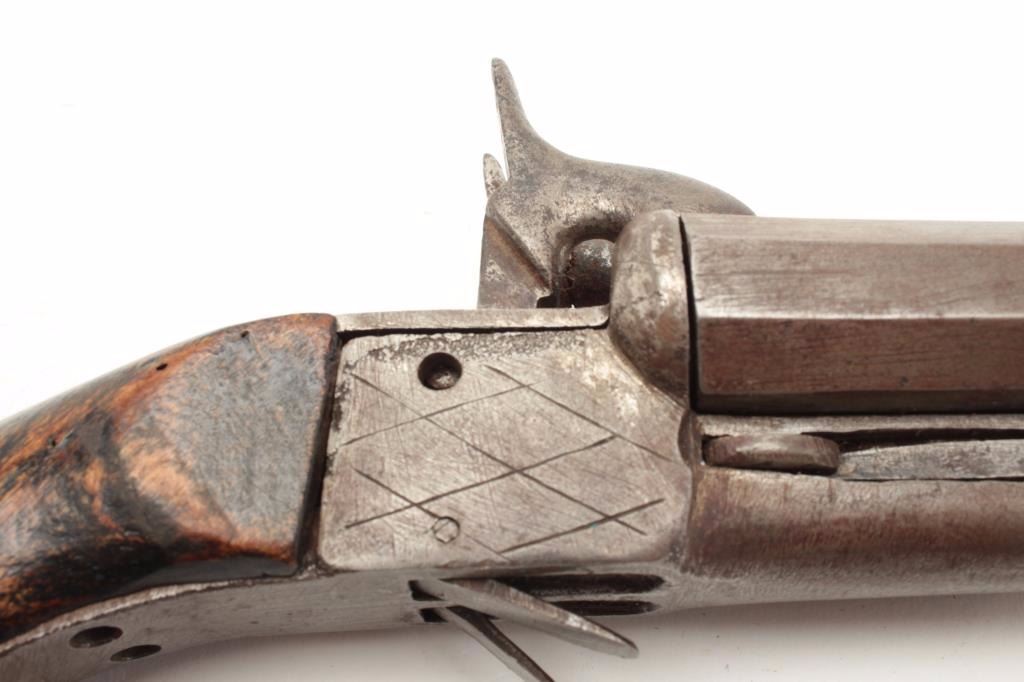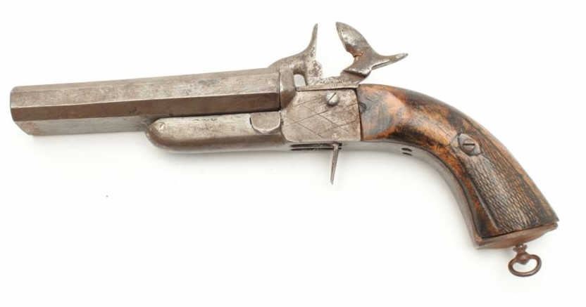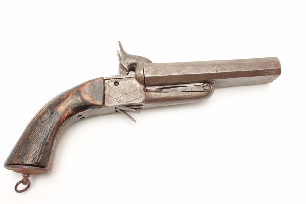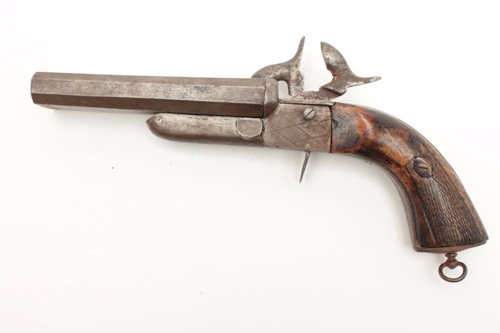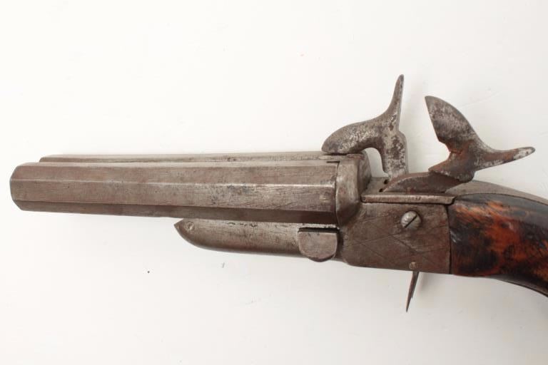 Lot 2055 Unmarked Spanish double barrel pinfire pistol, approximately .54 caliber. The pistol in in fair o