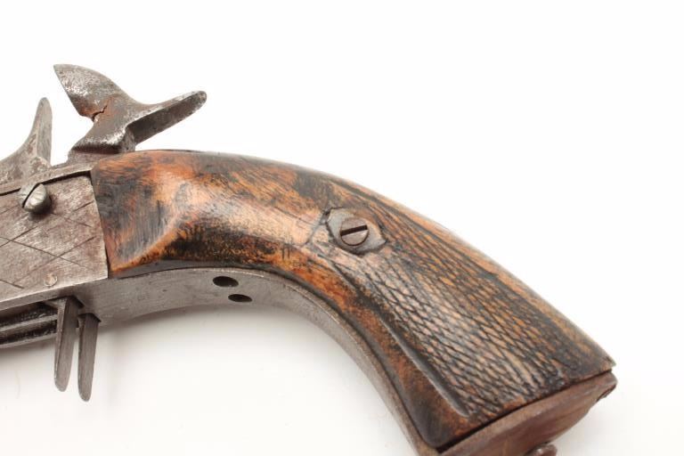 Unmarked Spanish double barrel pinfire pistol, approximately .54 caliber. The pistol in in fair overall condition with 5” barrels. The action is not working at the time of description. The checkered woodgrips shoe heavy use with flattened checkering and numerous mars. The metal parts have a brown patina with light surface rust. (Antique) Est.: $50-$100.