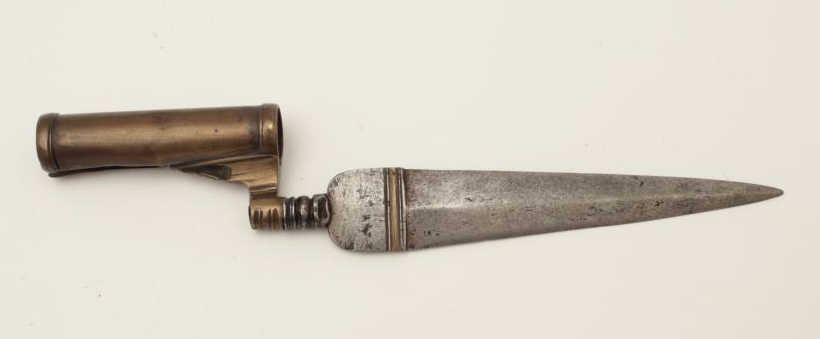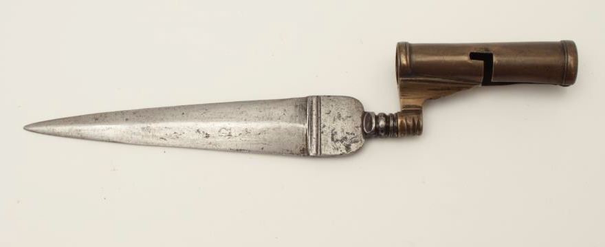 Eighteenth Century bayonet for a European Sporting gun, approximately 10” overall with a 6.5” blade. Est.: $150-$300.