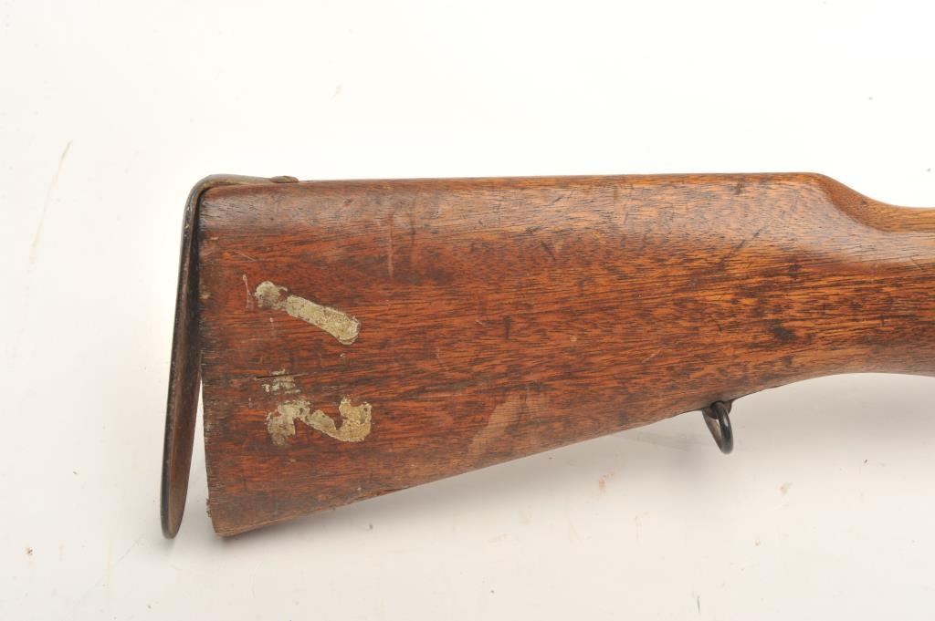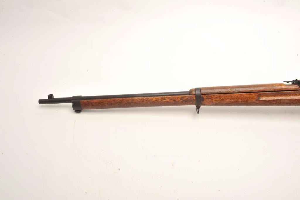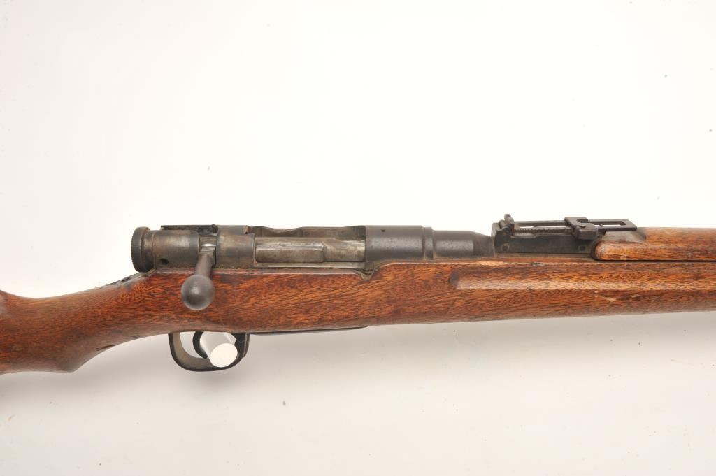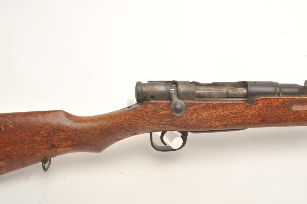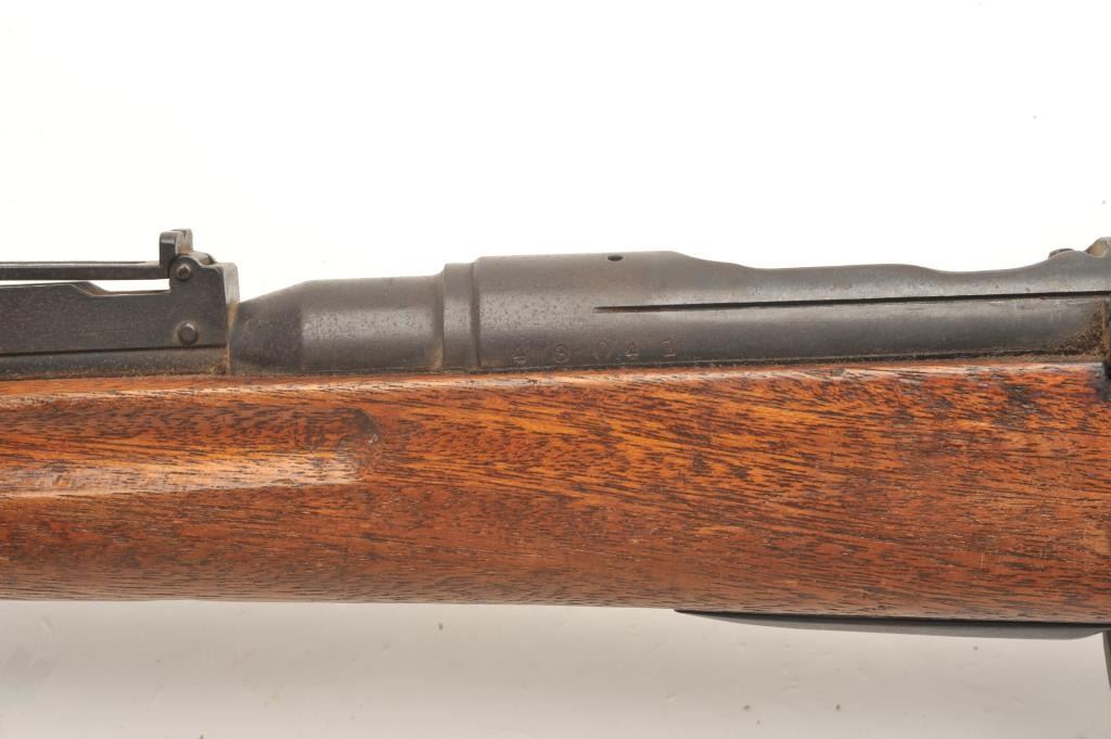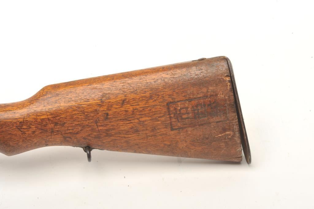 Japanese Arisaka bolt action rifle, 6.5 caliber, serial #43041. The rifle is in fair overall condition with a 31” barrel with a post front and military style ladder rear sight. The barrel and receiver have bothtaken on a brown patina with light surface and erosion noted. The smooth wood stock is in fair condition showing heavy use with considerable mars and compressions and loose steel butt plate. The butt stock has acartouche on the left side in Japanese characters. The bore is poor with pitting; the action functions and the markings are legible on this Arisaka training rifle. (C+R) Est.: $75-$150.