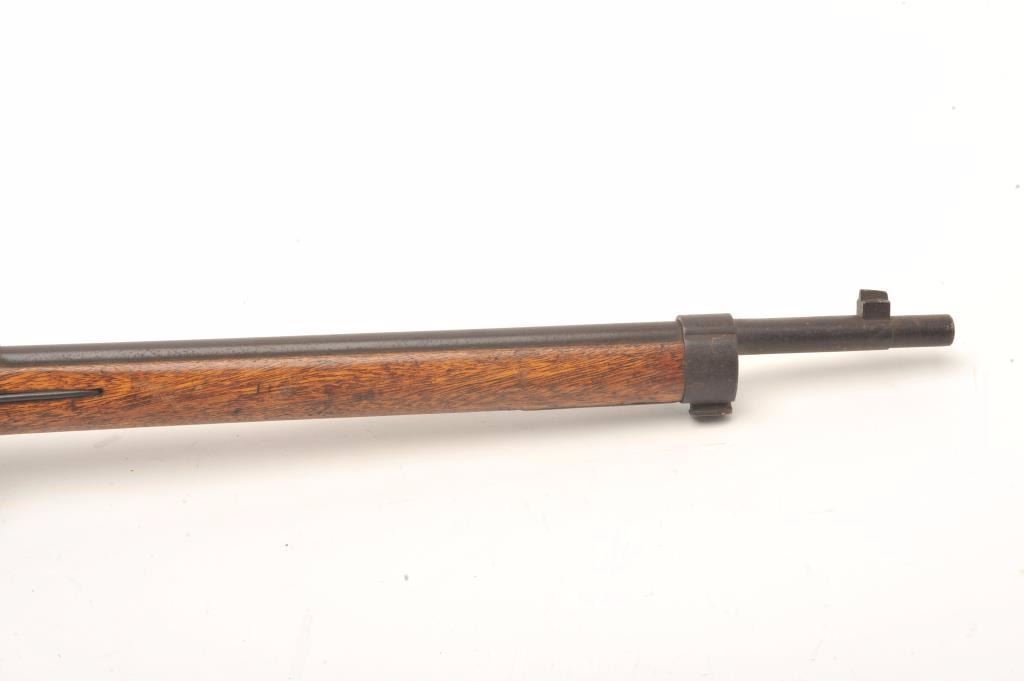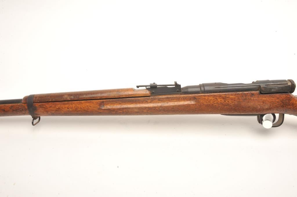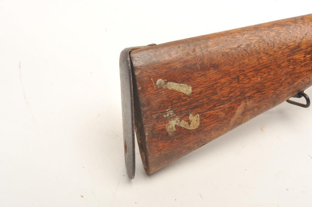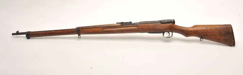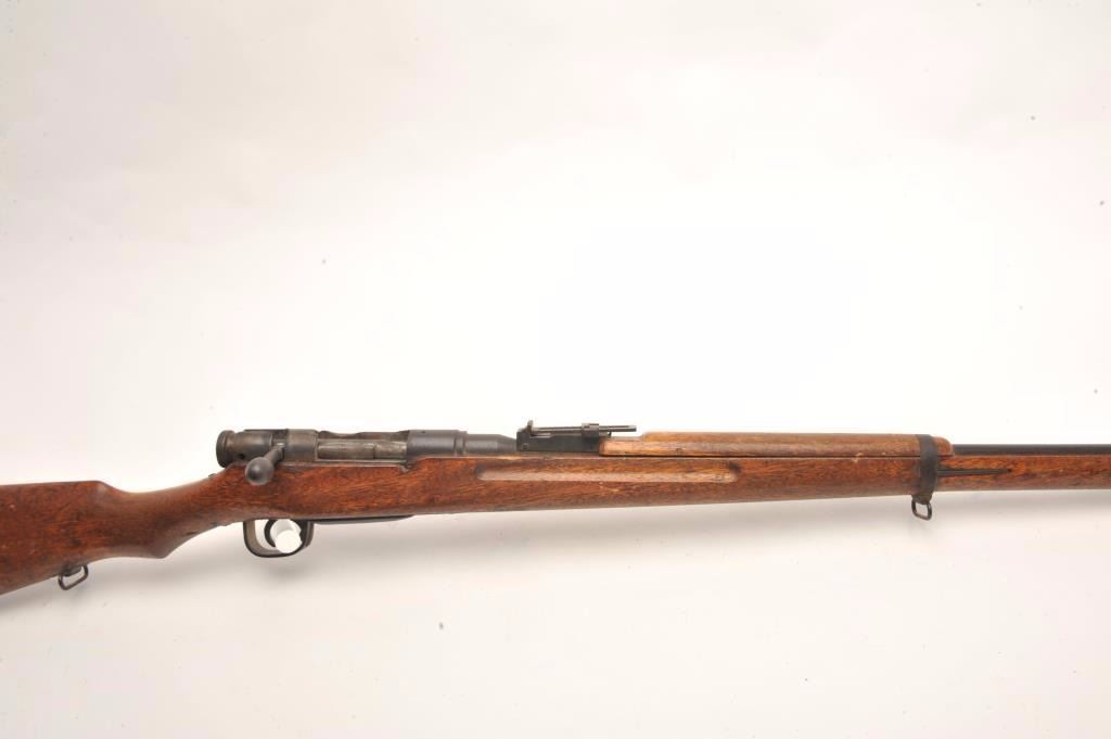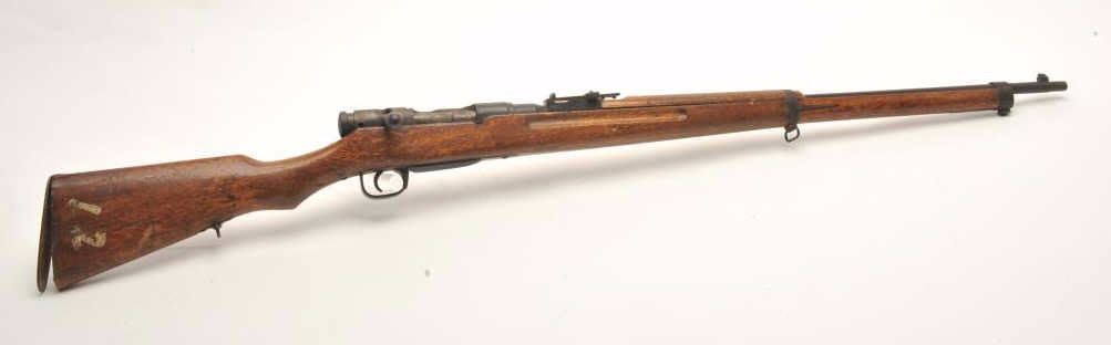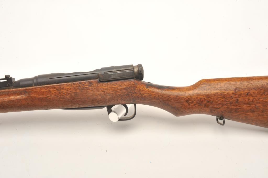 Japanese Arisaka bolt action rifle, 6.5 caliber, serial #43041. The rifle is in fair overall condition with a 31” barrel with a post front and military style ladder rear sight. The barrel and receiver have bothtaken on a brown patina with light surface and erosion noted. The smooth wood stock is in fair condition showing heavy use with considerable mars and compressions and loose steel butt plate. The butt stock has acartouche on the left side in Japanese characters. The bore is poor with pitting; the action functions and the markings are legible on this Arisaka training rifle. (C+R) Est.: $75-$150.