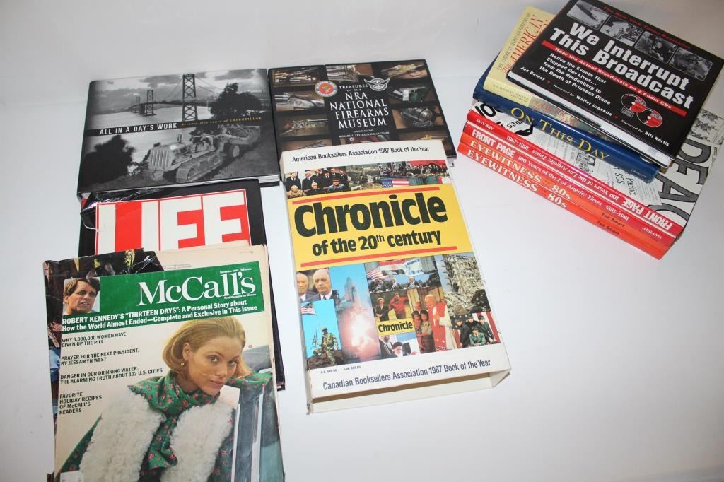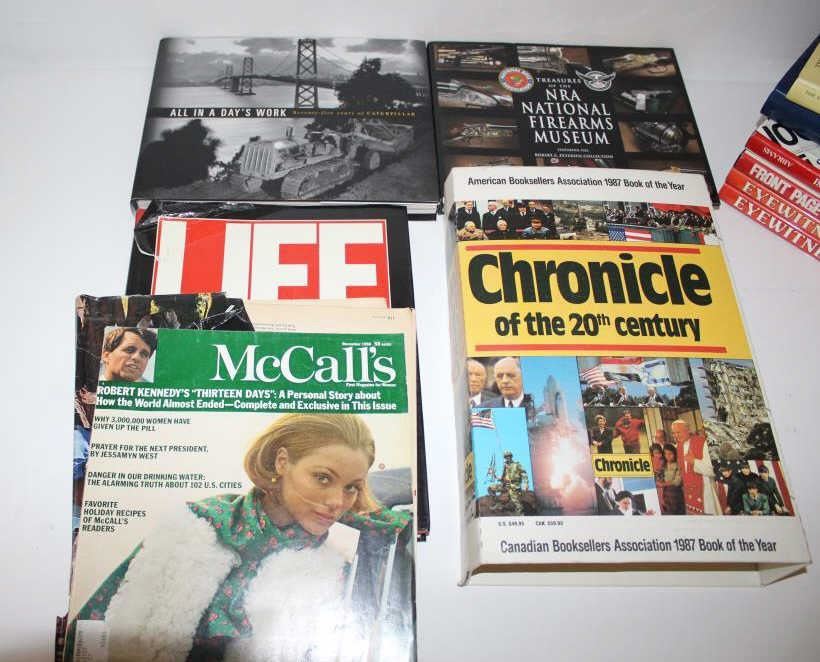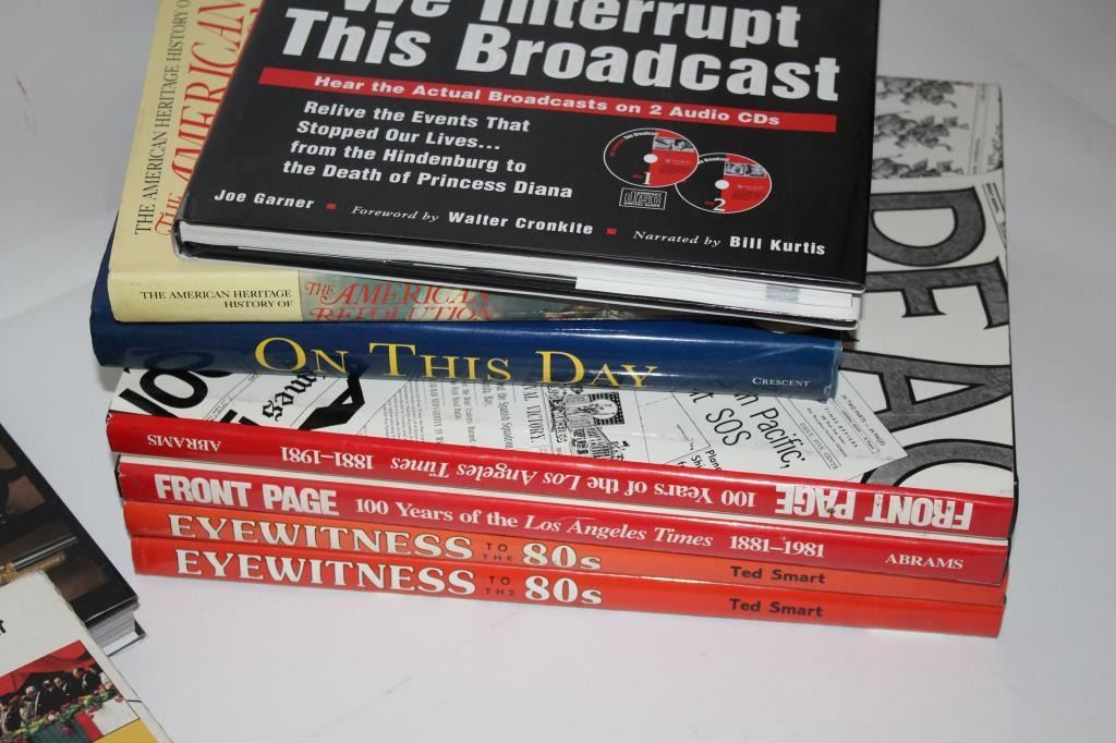 ): Lot of 11 general American history books including front pages of the L.A. Times, Treasures of the NRA National Firearms Museum, History of the American Revolution, etc. Est.: $75-$150.