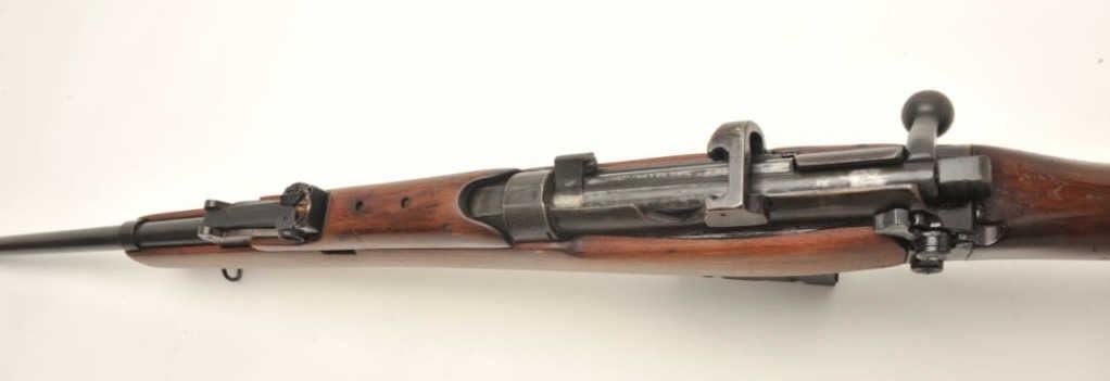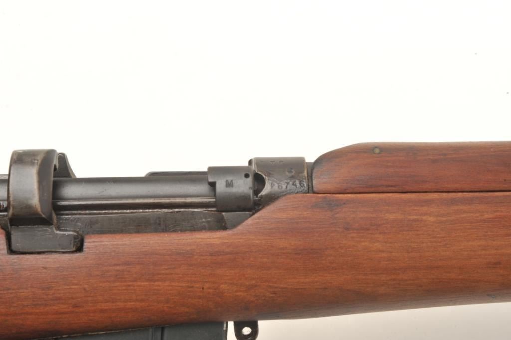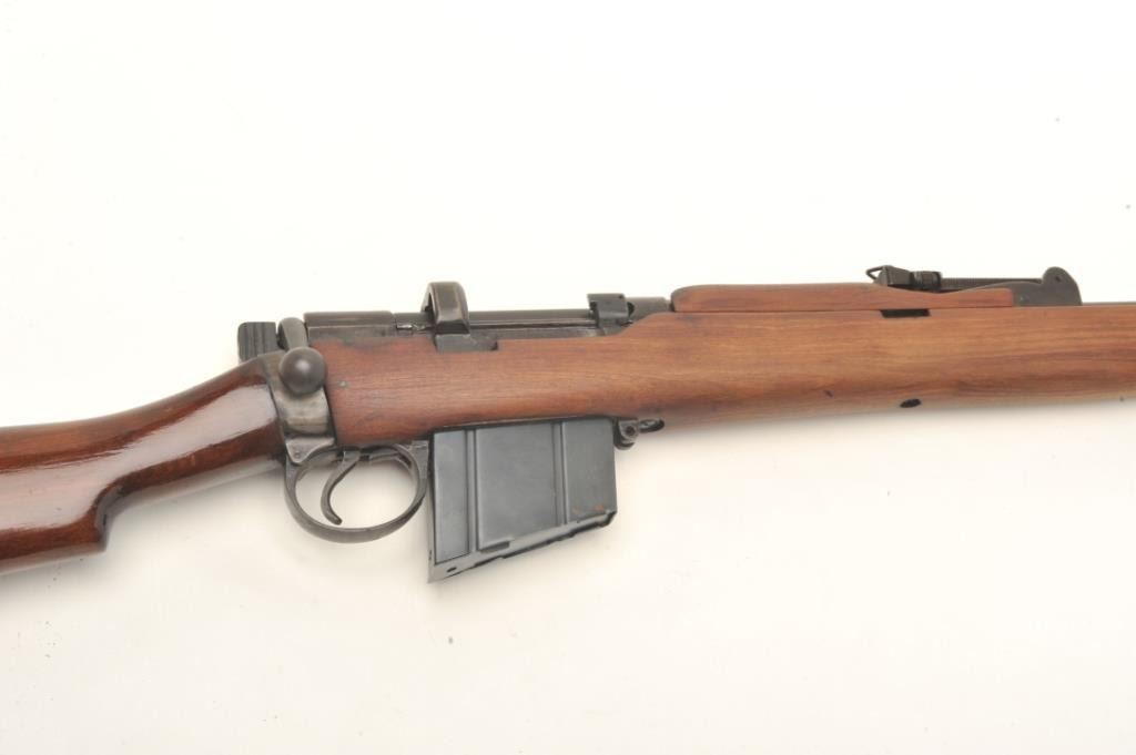 Enfield S.M.L.E. No III bolt action rifle in .303 caliber dated 1941. The lug and band has been removed when sporterized. Measures 44 ½” overall with a 25” barrel. The bore is very good and the action is good. No mag. The stock has been sanded and amateur refinish. (C&R) Est.: $50-$100