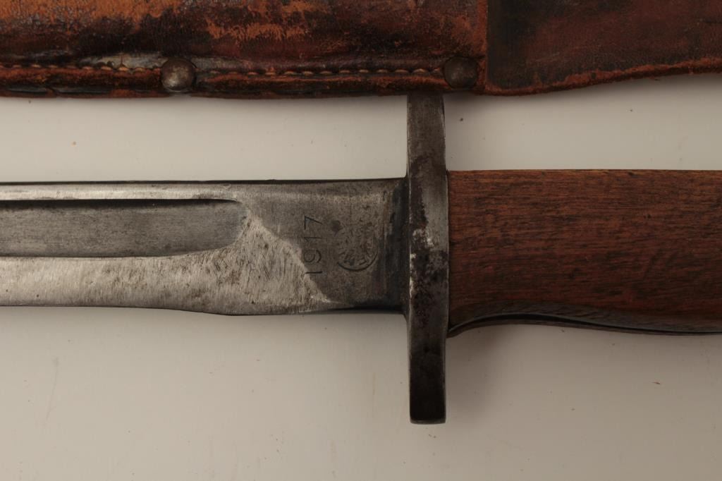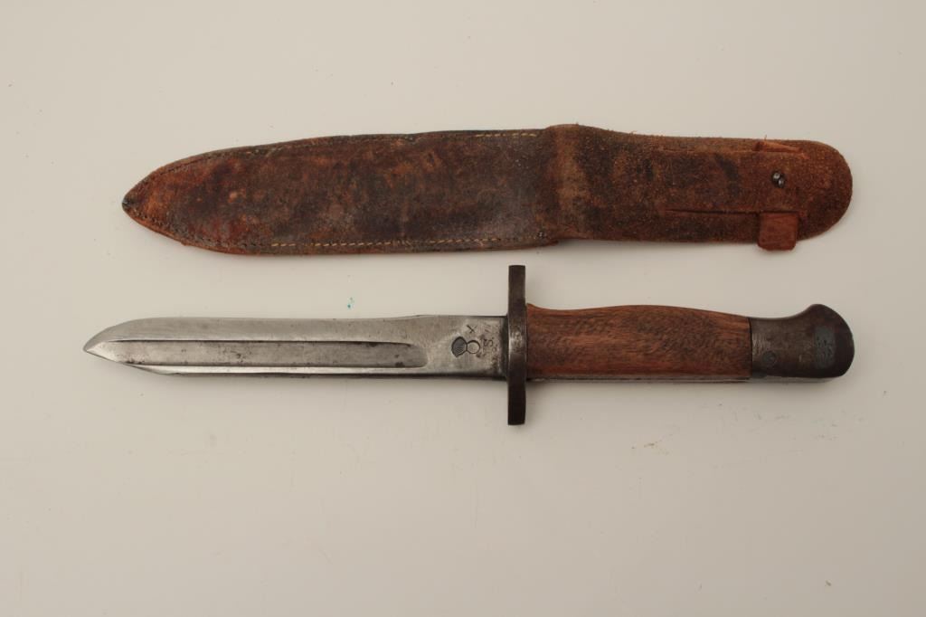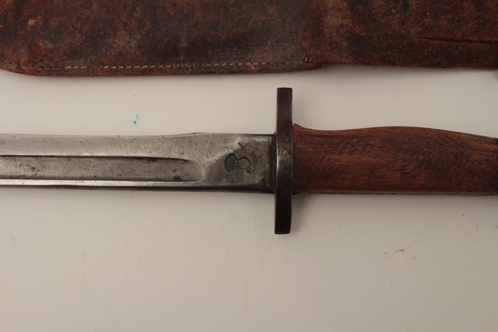 Lot 2084 Fighting knife made from WWII 1917 Enfield bayonet. Measures 11” overall with a 5 ¼” blade. The gr