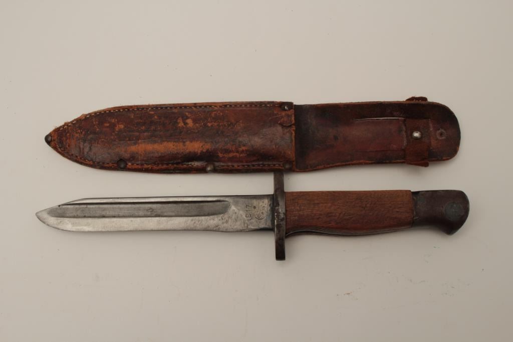 Fighting knife made from WWII 1917 Enfield bayonet. Measures 11” overall with a 5 ¼” blade. The grips have been changed with custom scabbard. Inked inscription but not quite legible. Probably “In theater” made.Est.: $40-$80