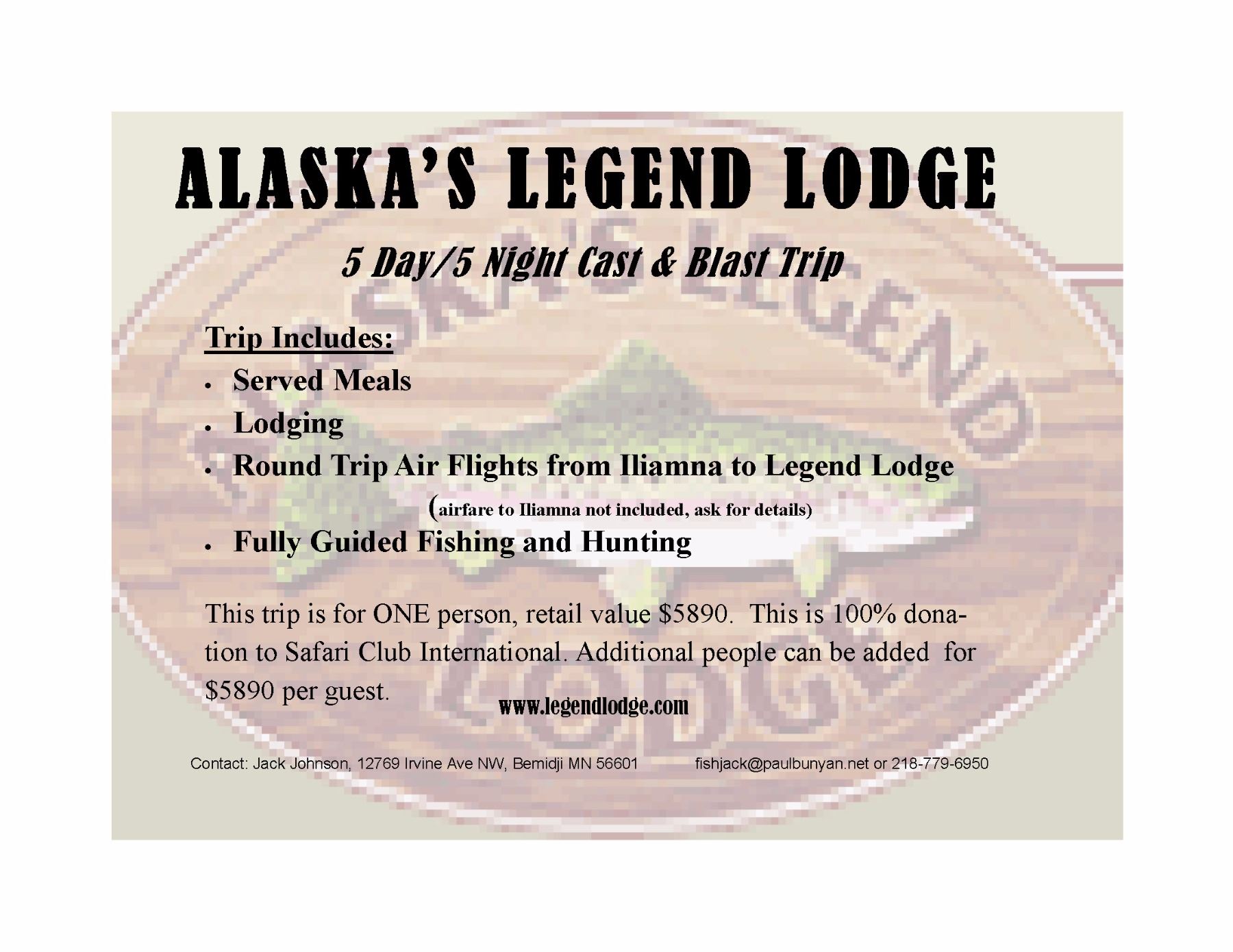 This trip is for ONE person, retail value $5890. This is 100% donation to Safari Club International. Additional people can be added for $5890 per guest.