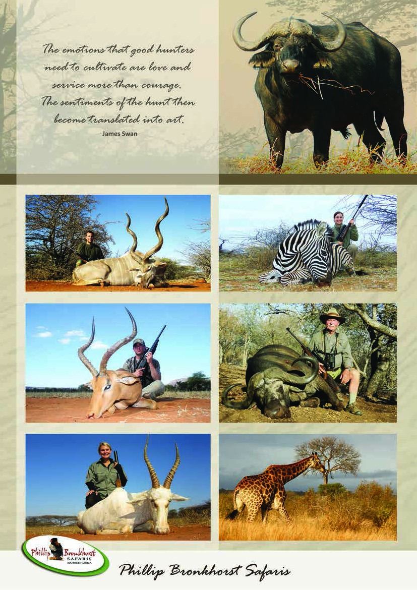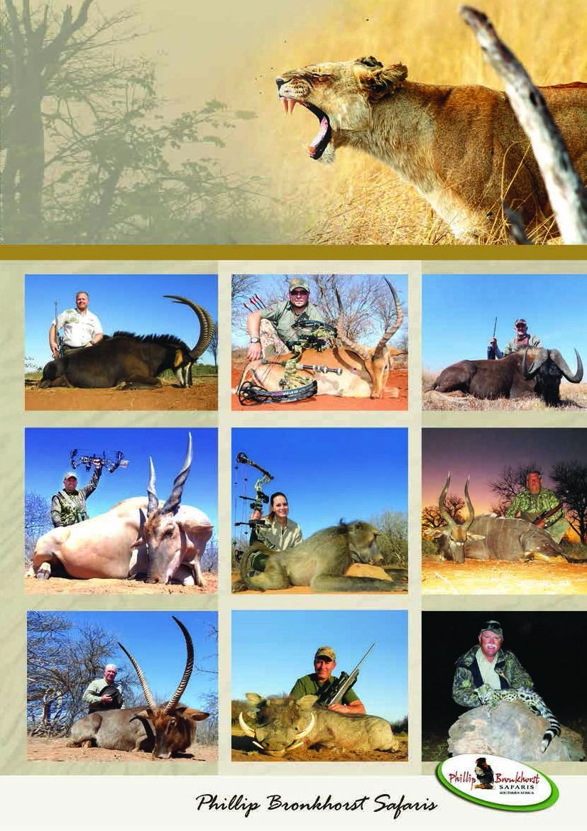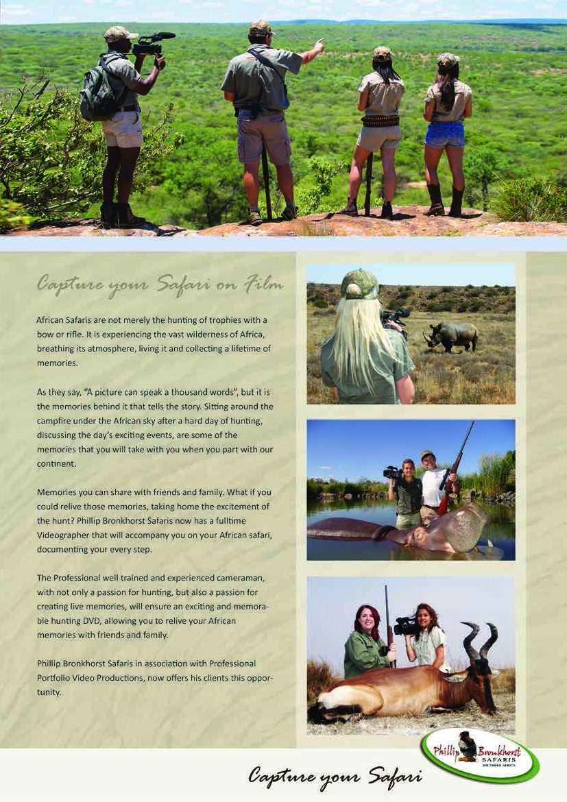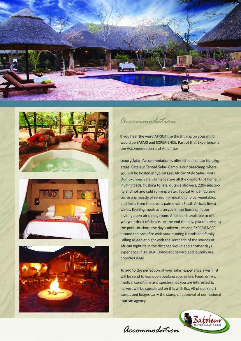 10 day South Africa Safari which include 7 days of hunting on a 1x1, 3 observer days which could be upgraded to hunt plains game for the hunter and 10 Observer days for the non hunter. The non hunter could upgrade to a hunter rate @ $ 225 per day 1x1. Gemsbuck, Impala Blue Wildebeest OR $ 3500 credit towards trophy fees. Also included for the observer is one Spa Treatment and one Elephant Back Safari! Not included is airport transfer fee of $500 and $1000 deposit to confirm safari.