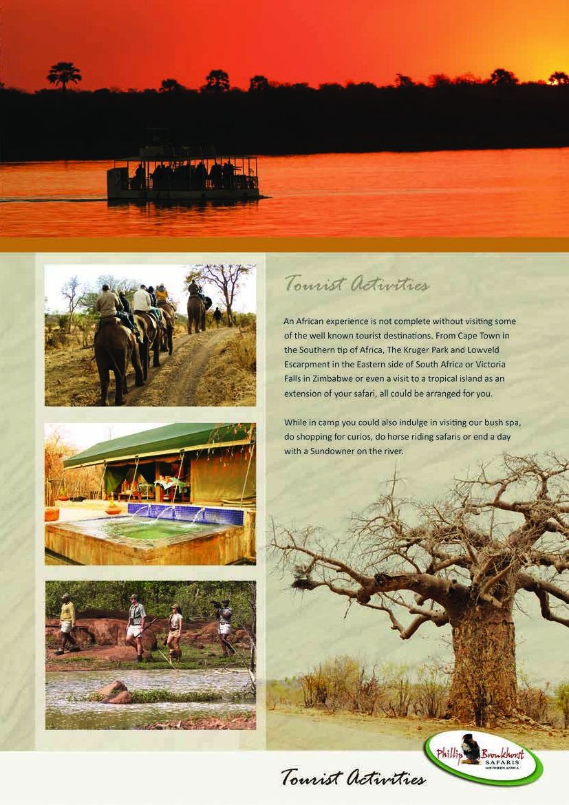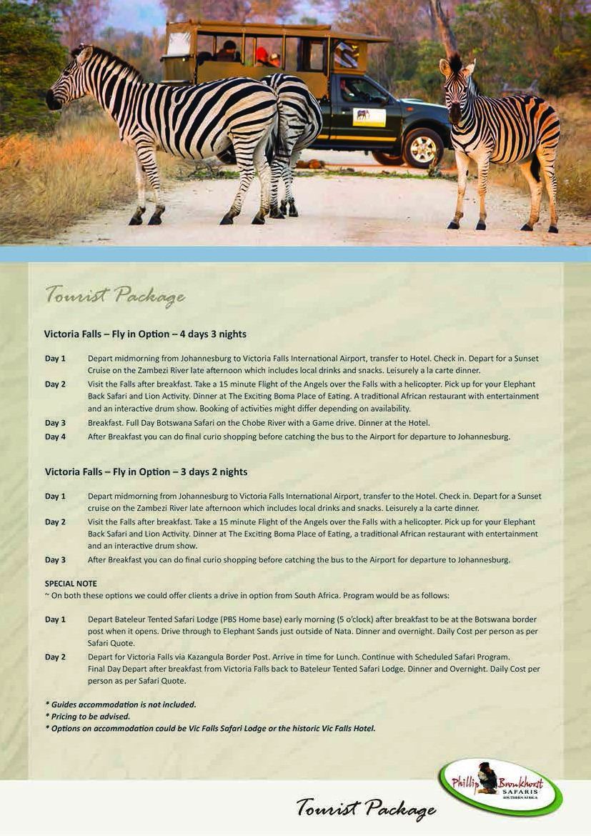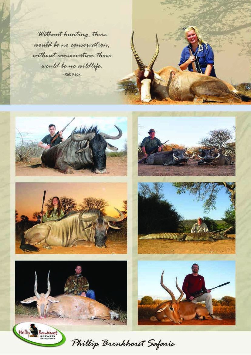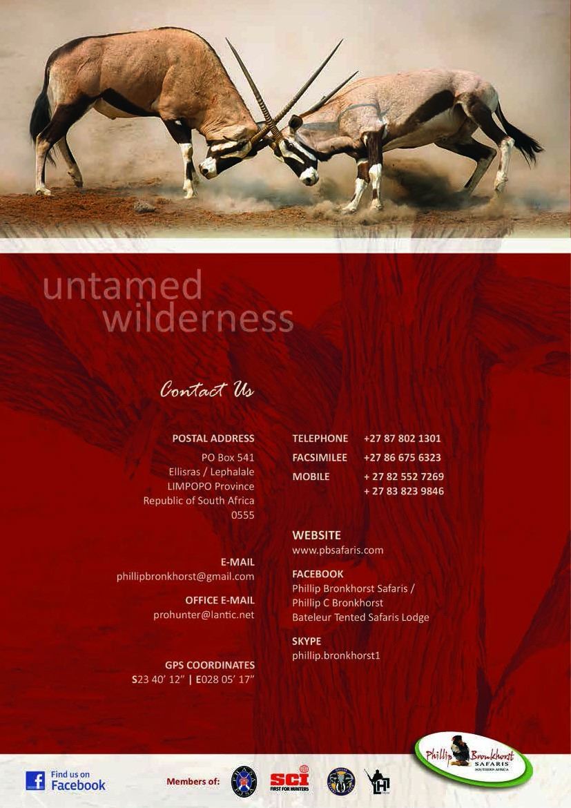 10 day South Africa Safari which include 7 days of hunting on a 1x1, 3 observer days which could be upgraded to hunt plains game for the hunter and 10 Observer days for the non hunter. The non hunter could upgrade to a hunter rate @ $ 225 per day 1x1. Gemsbuck, Impala Blue Wildebeest OR $ 3500 credit towards trophy fees. Also included for the observer is one Spa Treatment and one Elephant Back Safari! Not included is airport transfer fee of $500 and $1000 deposit to confirm safari.