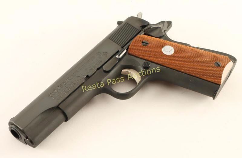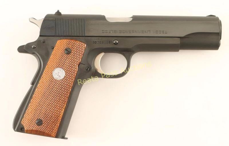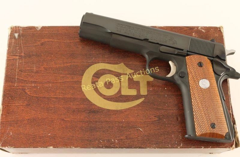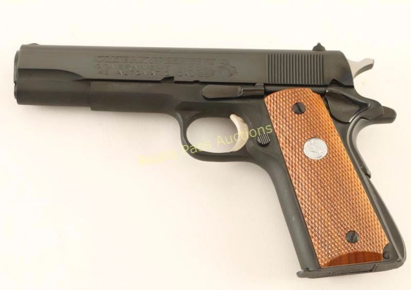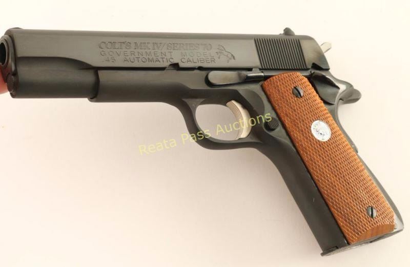 'MK IV/Series 70' Quality 1911-A1 style semi-automatic pistol chambered in .45 Automatic. Features a bright blued finish, 5" barrel, low profile patridge front sight, dovetailed rear window sight, serrated trigger, thumb safety, beavertail grip safety, serrated hammer spur, push button magazine release, factory magazine, serrated arched mainspring housing and two-piece checkered wood grips with silver Colt medallions. Includes the original factory wood grain cardboard box with document and hang tag. Pistol retains approximately 98% of it's original finish with slide wear on the barrel & a couple minor spots of wear observed on the slide. Action is smooth, bore is excellent and grips are fine. Condition is excellent in box. ***Modern Firearm***