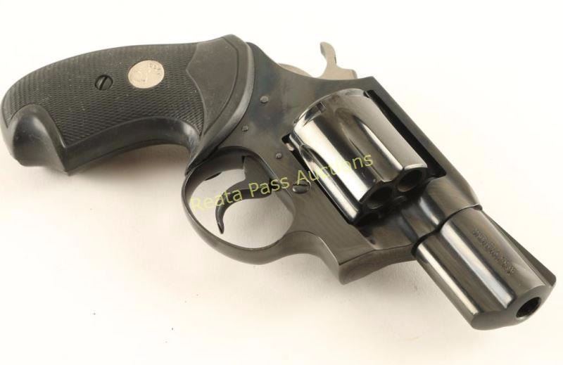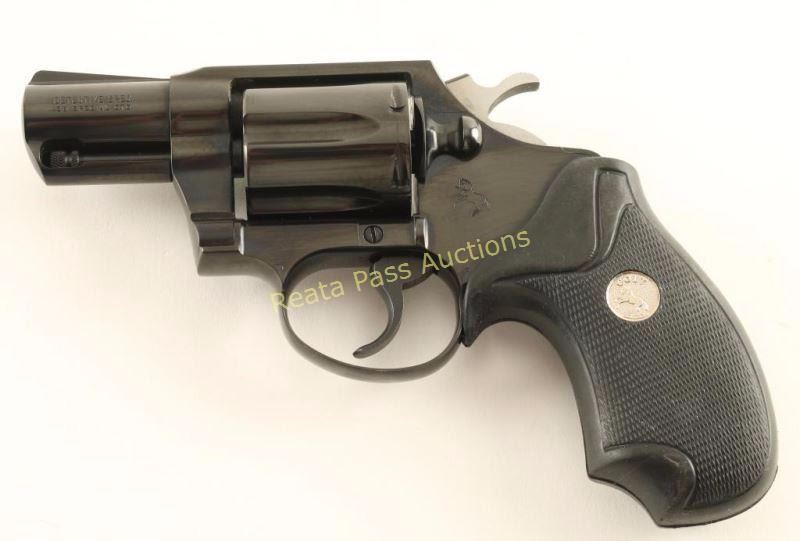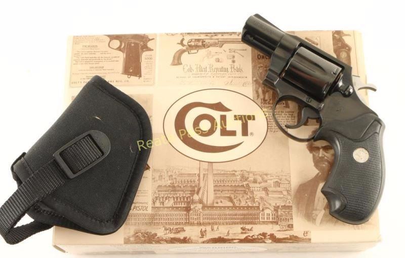 '4th Variation' Snub nosed double-action revolver chambered in .38 Special, circa 1993-1995. Features a blued finish, 2" barrel, ramped front sight, square notched rear sight, shrouded ejector rod, long fluted six-shot cylinder, smooth trigger, serrated hammer spur and Colt medallion two-piece checkered black rubber wrap-around grips. Includes the original factory hard case, sleeve & documents, and an Uncle Mike's sidekick holster. Revolver exhibits approximately 99% of it's original blued finish showing only a faint drag line on the cylinder. Action is smooth, bore is pristine, and grips are fine. Condition is near new in box. ***Modern Firearm***