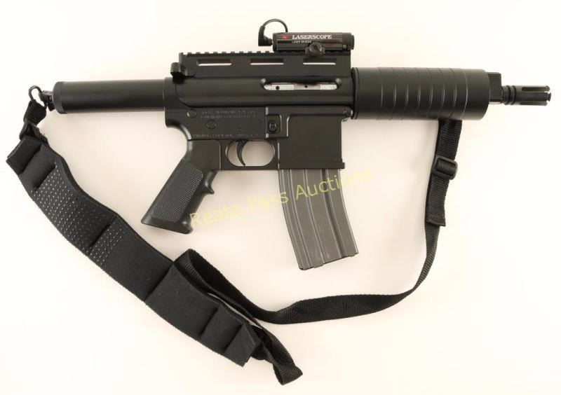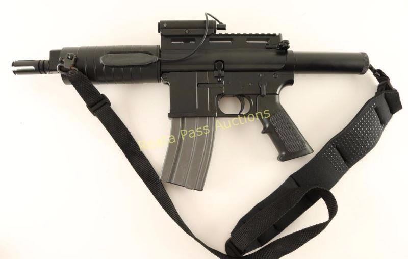 SN: 10947170 Pre-ban semi-automatic AR style pistol chambered in .223 Remington, circa 1993-1994. Features a black Bear Coat finish, 7" match grade barrel, Max Dynamic muzzle break, flat top receiver, Laserscope laser sight with tape switch, Young Mfg. Nation Match full-auto BCG, single stage trigger, push button magazine release, 30 round magazine, Butler Creek padded sling, proprietary buffer system, floated handguard and A2 style checkered black polymer pistol grip. Includes a factory padded soft case. Pistol exhibits approximately 99% of it's original finish showing few light handling marks with no major wear observed. Action is crisp, bore is excellent and polymer is fine. Condition is near new. ***Modern Firearm***