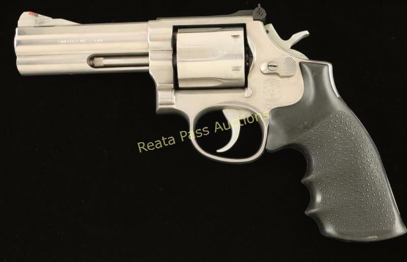 'Distinguished Combat Magnum' Medium frame stainless steel double action revolver chambered in .357 Magnum, circa 1980-1986. Features a brushed finish, 4" magna ported barrel with solid rib & full underlug, ramped front sight with orange insert, micrometer click rear sight, .312" smooth combat trigger, .375" semi-target hammer, fluted six-shot cylinder, and one-piece pebbled black rubbed Hogue Monogrip. Revolver exhibits only minor handling marks with no major wear observed. Action is smooth, bore is excellent and grips are fine. Condition is excellent. ***Modern Firearm***