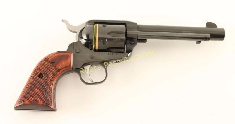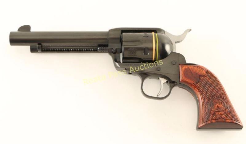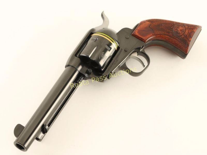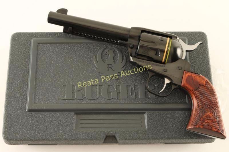 Sn: 510-91675 Commemorative single-action six-shot revolver chambered in .45 Colt, circa 2010. Talo special edition commemorating the companies 60th anniversary from 1949-2009, made in limited quantities. Features a blued finish, 5 1/2" barrel, ejector rod, blade front sight, square notched rear sight, fluted cylinder with gold band & alternating floral scroll/Ruger insignia engraving between the flutes, smooth trigger, serrated hammer spur, internal locking safety, and checkered two-piece laminated wood grips with laser engraved Ruger insignia over a banner that reads " 1949/SIXTY YEARS/2009". Includes the original factory hard case with documents, spent case, and lock. Revolver exhibits a light drag line with no other wear observed. Action is smooth with very good lock-up, bore is pristine and grips are extra fine. Condition is near new in box. ***Modern Firearm***