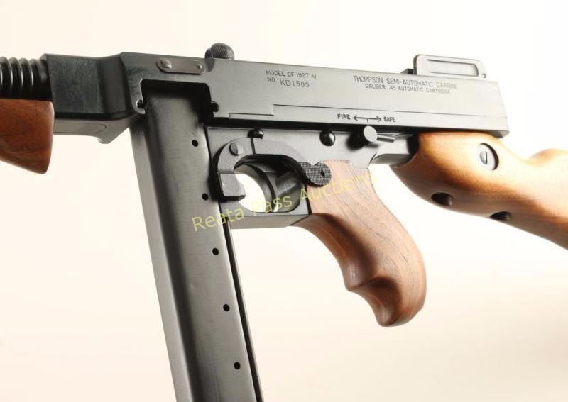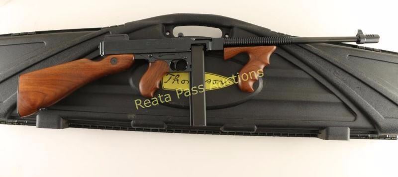 SN: KD1505 Recently manufactured semi-automatic rifle chambered in .45 Auto and modeled after the iconic 'Tommy Gun'. Features a blued finish, 16.5" finned barrel with Cutts style compensator, blade front sight, adjustable flip-up rear sight, steel receiver, checkered charging handle, manual safety, smooth trigger, 30 round stick magazine, American walnut vertical foregrip, pistol grip and fixed shoulder stock with sling swivel & metal buttplate. Includes a factory hard case with fitted inserts, lock, and 50 round drum magazine. Rifle exhibits approximately 97% of it's original finish showing light wear around the magazine well with no other wear observed. Action is strong, bore is pristine and wood stocks are fine. Condition is excellent in case. ***Modern Firearm***