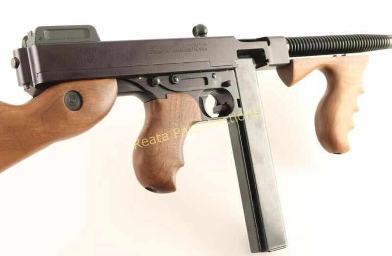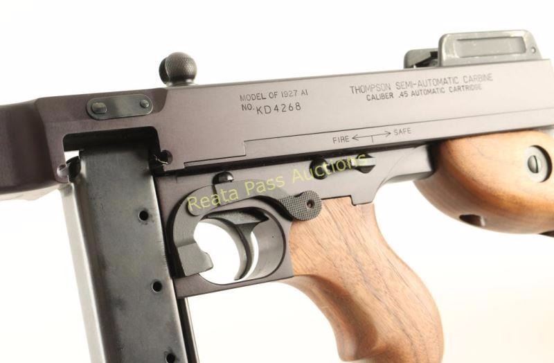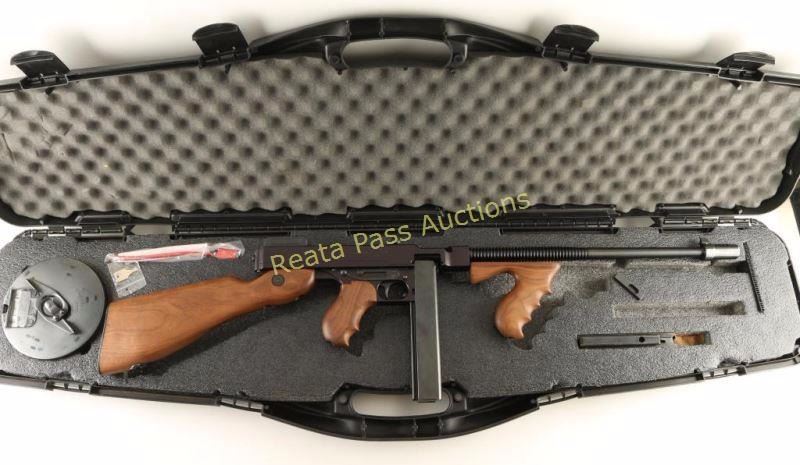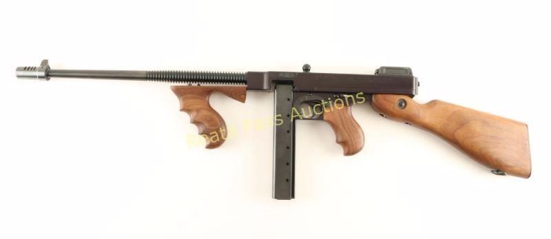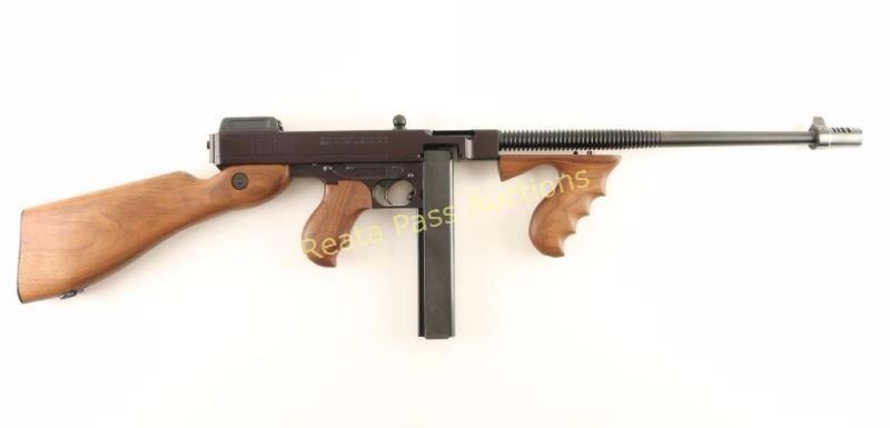 SN: KD4268 Recently manufactured semi-automatic rifle chambered in .45 Auto and modeled after the iconic 'Tommy Gun'. Features a blued finish, 16.5" finned barrel with Cutts style compensator, blade front sight, adjustable flip-up rear sight, steel receiver, checkered charging handle, manual safety, smooth trigger, 30 round stick magazine, American walnut vertical foregrip, pistol grip and fixed shoulder stock with sling swivel & metal buttplate. Includes a factory hard case with fitted inserts, documents, lock, 20 round stick magazine, and 50 round drum magazine. Rifle exhibits approximately 97% of it's original finish showing a couple light scratches/scuffs on the barrel and edge wear on the rear sight. Action is strong, bore is pristine and wood stocks are near fine with a couple small blemishes on the buttstock. Condition is excellent in case. ***Modern Firearm***