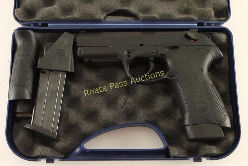 Italian made double-action semi-automatic pistol chambered in .45 ACP, circa 2014. Features a satin black finish, 4.1" barrel, three-dot sights, front & rear cocking serrations on the slide, ambidextrous safety/decocker, smooth trigger, exposed hammer with serrated round spur, reversible push button magazine release, 10 round factory magazine, and black polymer frame with integral accessory rail & interchangeable backstraps. Includes the original factory hard case with documents, cleaning tools, lock, speed loader, 9 round magazine and two additional backstraps. Pistol exhibits little to no visible wear. Action is smooth, bore is pristine and polymer is fine. Condition is like new in box. ***Modern Firearm***