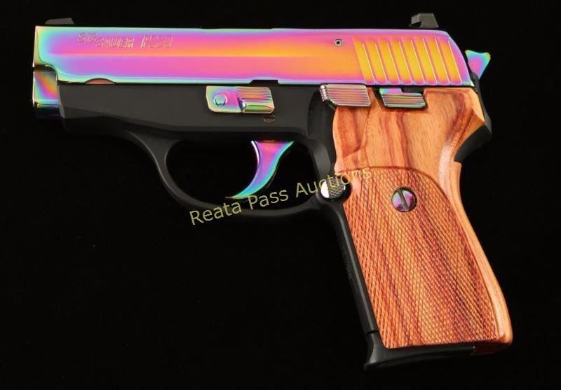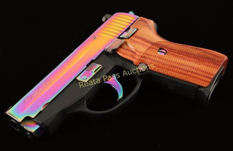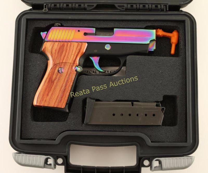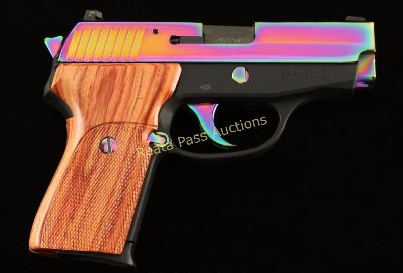 American made compact double-action semi-automatic pistol chambered in .40 Smith & Wesson. Features a Rainbow Titanium/black anodized finish, stainless steel slide, 3.6" barrel, Siglite three-dot night sights, smooth trigger, serrated round hammer spur, thumb decocker, push button magazine release, 7 round factory magazine, alloy frame and two-piece checkered laminated wood wrap-around grips. Includes the original factory hard case with lock and two spare magazines. Pistol exhibits some fine superficial scratches on the slide and light slide wear on the barrel. Action is crisp, bore is excellent and wood grips are near fine. Condition is excellent in case. ***Modern Firearm***