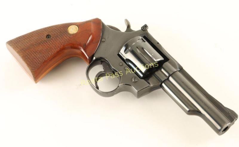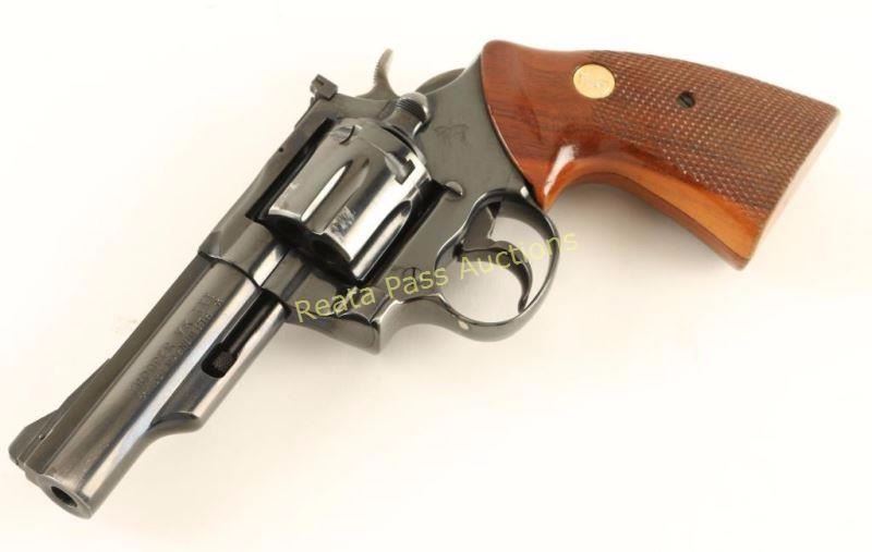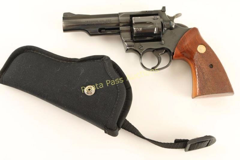 Quality double-action revolver chambered in .357 Magnum, designed to be the target-grade version of the MK III series, circa 1969 - 1983. Features a blued finish, 4" barrel with solid top rib, shrouded ejector rod, ramped & pinned patridge front sight, adjustable rear sight window, fluted six-shot cylinder, smooth wide trigger, case hardened hammer with checkered spur and Colt medallion two-piece checkered walnut grips. Includes an Uncle Mikes black nylon Sidehick holster. Revolver retains approximately 91% of it's original blued finish with minor handling marks, a drag line and light/moderated holster wear. It appear that the ejector rod spring is missing or bound as the ejector does not return on it’s own after being pushed. Action is smooth with good lock-up, bore is excellent and grips are very good. Condition is very good+. ***Modern Firearm***