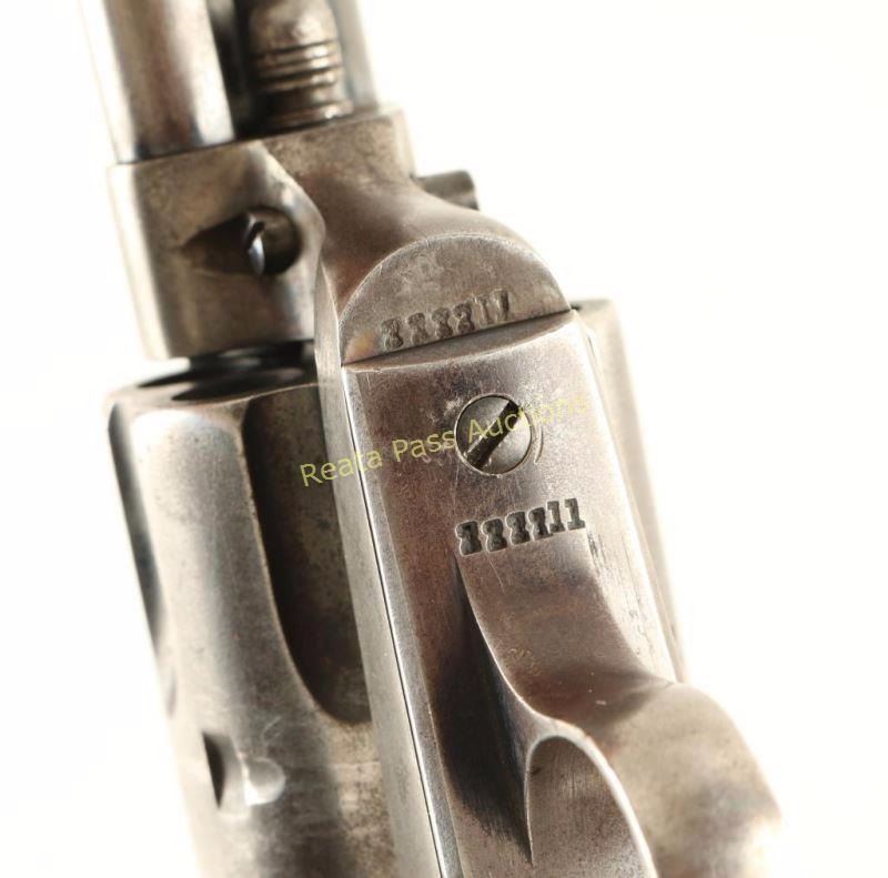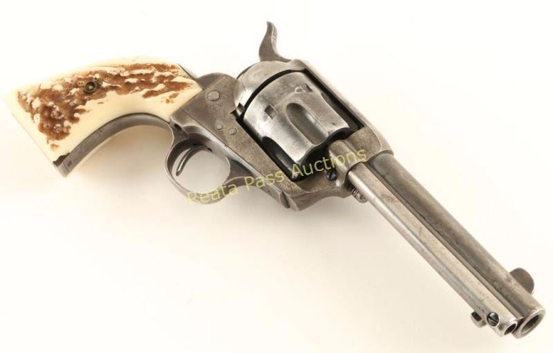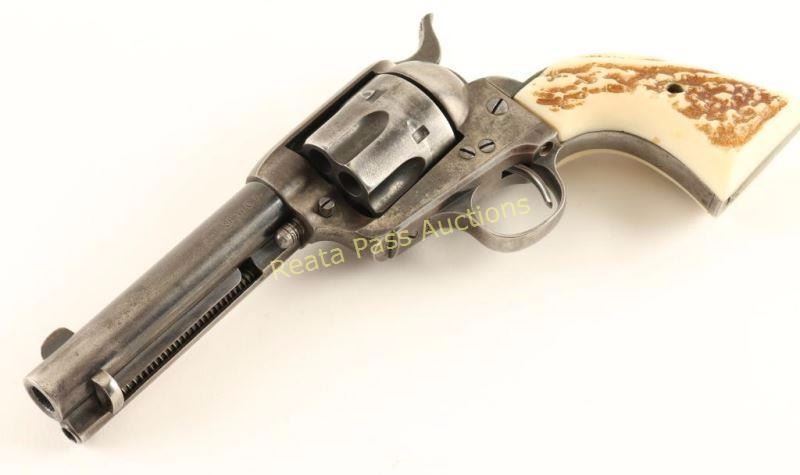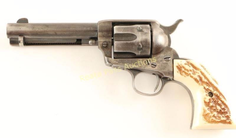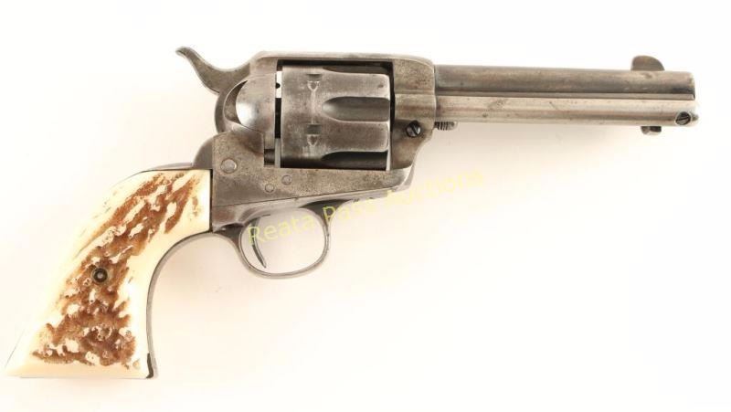 'First Generation' Single action six-shot revolver chambered in .38-40 Winchester, circa 1902. Features a blued/case hardened finish, 4 3/4" barrel with two line address, ejector rod, blade front sight, v-notched rear sight, checkered hammer spur, fluted cylinder and two-piece faux stag grips. Markings are mostly good and all serial numbers match. Revolver exhibits approximately 10% of it’s original finish with the balance of the metal surfaces bearing a light grey/brown patina. Action is strong with four clicks, bore is good with light scattered pitting and grips are very good with a small loss the to toe on the right panel. Condition is good+. ***C&R Firearm*** ***Modern Firearm***