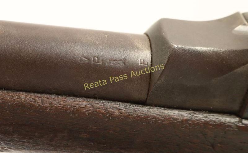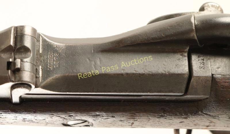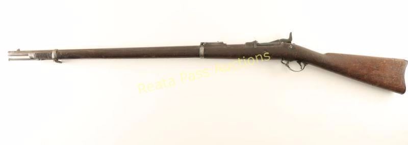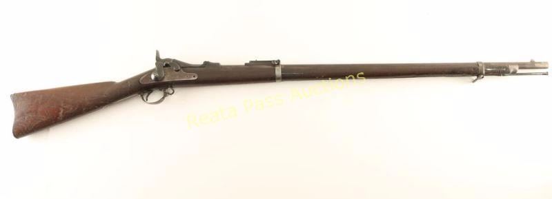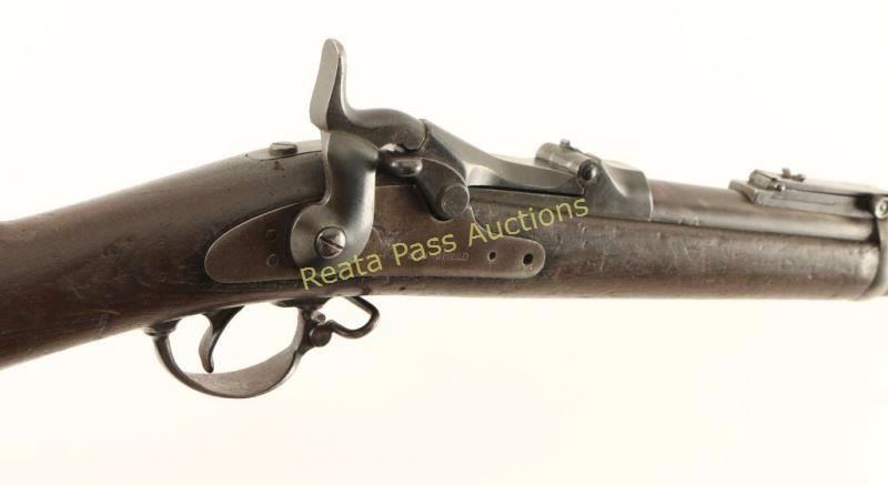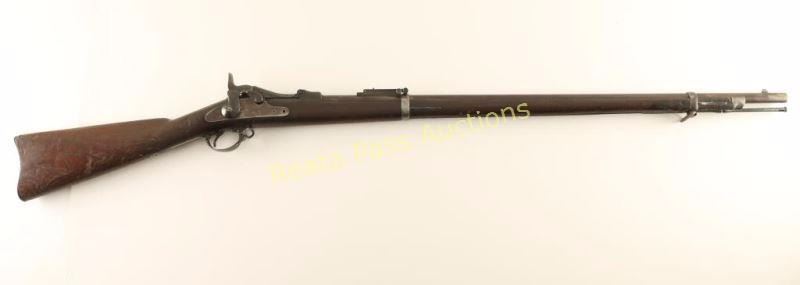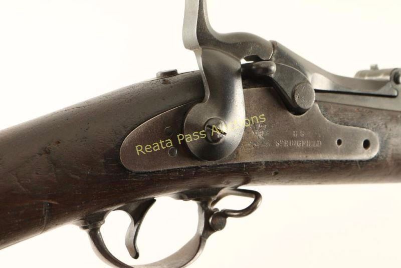 U.S. Military breechloading single-shot service rifle chambered in .45-70 Government, circa 1866. Features a blued/case hardened finish, 32.6" tapered barrel, two barrel bands, blade front sight, Buffington adjustable rear sight, sling swivels, cleaning rod, serrated trigger, checkered hammer spur, and full length walnut shoulder stock with "U.S." marked metal buttplate. Markings: Breech - "U.S./Model/1873". Barrel - V/P/Eagle Head, "A" & "P". Lock - "U.S./SPRINGFIELD" & eagle/arrows. Rifle exhibits a nice even brown patina on the barrel & lock and a dark patina on the receiver & hammer. Action is sound, bore is very good, and wood stock is good showing a fine crack on the left side of the receiver & numerous small blemishes throughout. Condition is very good. ***Antique Firearm***
