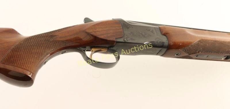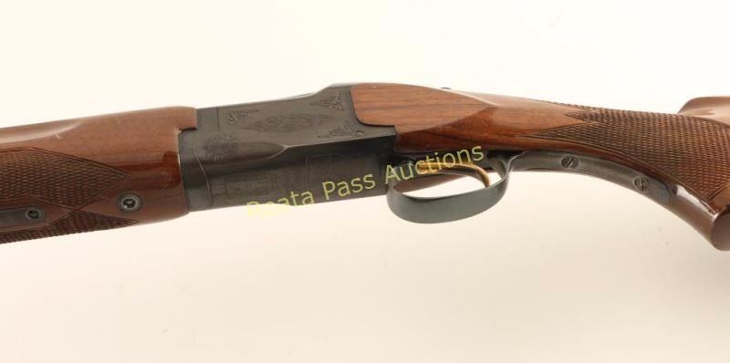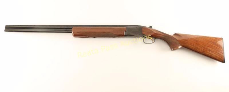 Blued, made in Japan, over/under shotgun with 26" barrels, full over modified fixed chokes, raised and ventilated sight rib, single front bead, ejectors, 3" chambers, inertia re-set single trigger, manual safety with barrel selector, checkered 2-piece walnut furniture and a plastic buttplate. Bluing on barrels has a little surface rust. "Engraved" receiver and forend iron have freckles from surface rust. The trigger guard is fading to a grey with slight edge wear and it has gone to grey on the pistol grip tang. The safety has turned to a flat grey with some surface rust. Bores are bright and shiny. Action works well. Walnut furniture has checkered panels on the forend and the pistol grip. The forend has a crack running from the rear escutcheon to the stock iron and scuffs, rubs and dings. The butt has dings, rubs and scratches. The factory butt plate has a chip at the toe and scratches at the heel. Condition is good to very good. *Modern Firearm*