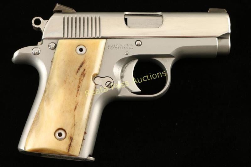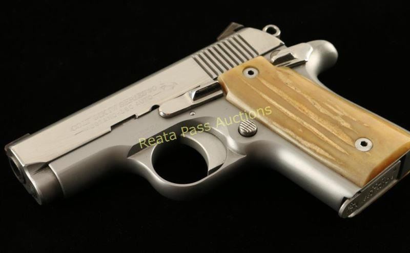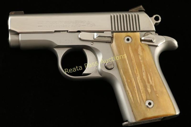 'MK IV/Series'80' Stainless steel semi-automatic pocket pistol chambered in .380 Automatic. Features a stain/polished finish, 2 3/4" barrel, dovetailed patridge front sight, drift adjustable rear window sight, beveled trigger, serrated round hammer spur, push button magazine release, factory magazine, thumb safety, and custom two-piece stag grips. Pistol exhibits light handling wear and displays semi-soft slide markings. Action is crisp, bore is very good+ and grips are near fine with a small crack on the left panel extending from the upper screw. Condition is very good+++. ***Modern Firearm***