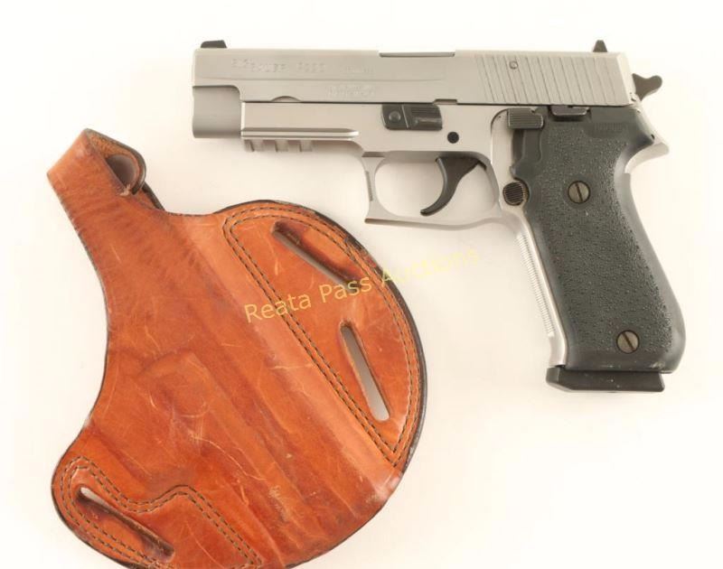 Quality stainless steel double-action semi automatic pistol chambered in .45 Auto. Features a satin finish, blued 4.4" barrel, adjustable sights, thumb de-cocker, push button magazine release, 8 round factory magazine, serrated trigger, steel frame with integral accessory rail & checkered front strap, exposed hammer with serrated round spur and Hogue two-piece pebbled black rubber grips. Includes a Bianchi brown leather holster for a Sig P229R. Pistol exhibits little uses with only slide wear on the barrel observed. Action is crisp, bore is pristine and rubber grips are fine. Condition is excellent. ***Modern Firearm***