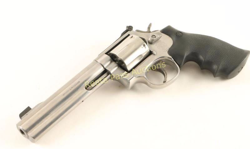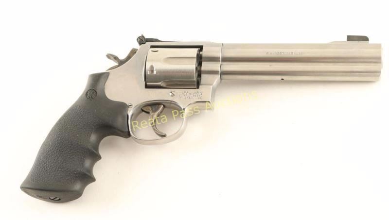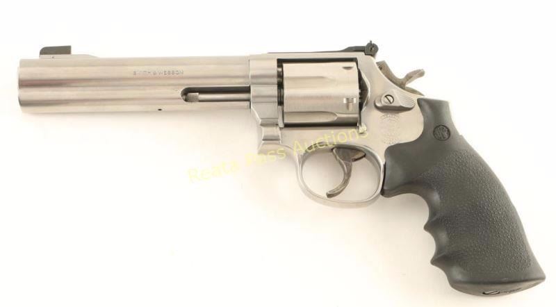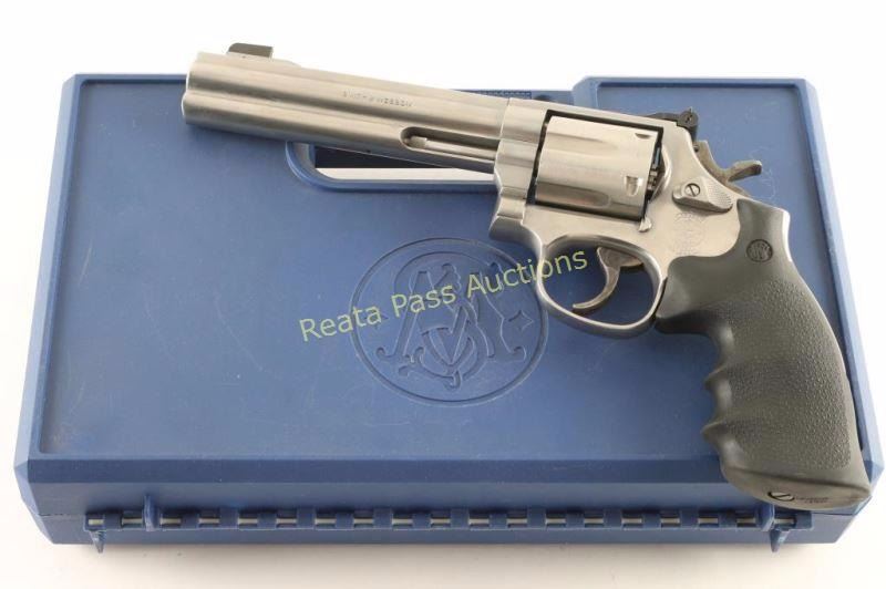 'Powerport' Medium frame stainless steel double action revolver chambered in .357 Magnum, circa 1994-2001. Features a brushed finish, 6" Powerport barrel with solid rib & full underlug, pinned patridge front sight, micrometer click rear sight, case hardened .312" smooth combat trigger, .375" case hardened semi-target hammer, fluted six-shot cylinder, and one-piece pebbled black rubbed grips with S&W logo. Includes the original factory box with documents and wax paper. Revolver exhibits little to no visible signs of use or wear. Action is smooth, bore is excellent and grips are fine. Condition is near new in box. ***Modern Firearm***