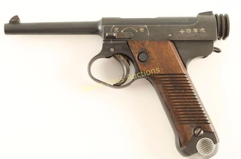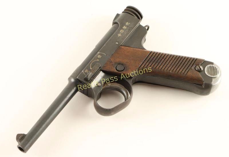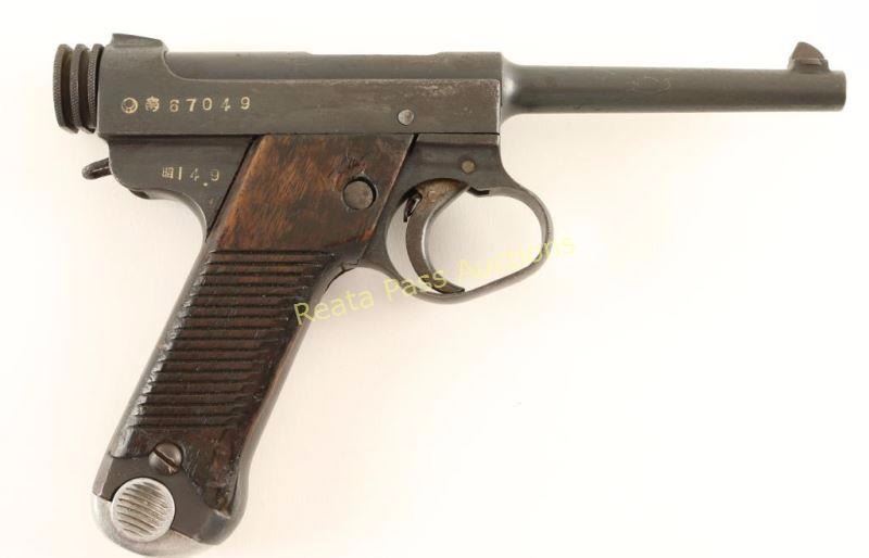 Late production Japanese military semi-automatic service pistol chambered in 8mm, circa 1939. Features a blued finish, 4.7" barrel, dovetailed blade front sight, notched rear window sight, steel frame, large trigger guard, smooth trigger, checkered cocking piece, manual safety, magazine safety, push button magazine release, 8 round magazine, lanyard loop and two-piece grooved wood grips. No import marks and serial numbers match on the frame, barrel, bolt, cocking piece, trigger guard, trigger, trigger sear, magazine release, locking block & magazine safety. Markings: Upper receiver - Nagoya Kokubunji first run stamp. Frame - "14.9". Magazine - "149". Pistol exhibits approximately 60% of it's blued finish showing scattered light pitting throughout and wear on the upper receiver & triggerguard. Action is smooth, bore is bright with little rifling & some light pitting and wood grips are good. Condition is good. ***C&R Firearm*** ***Modern Firearm***