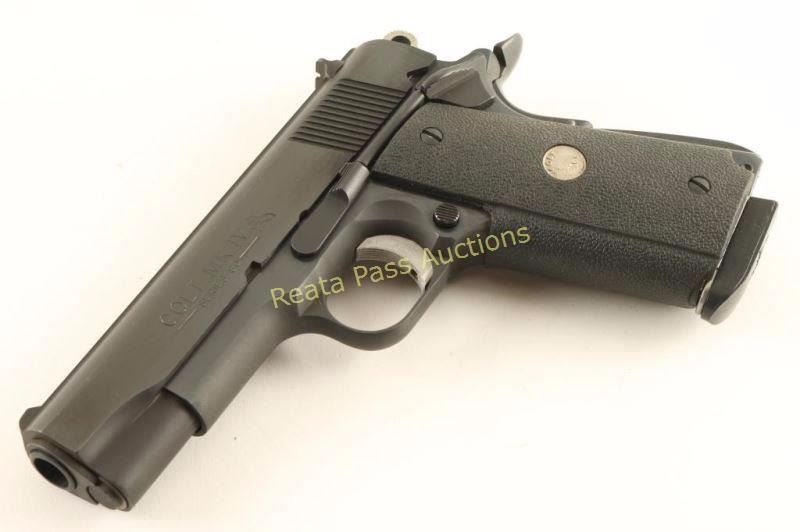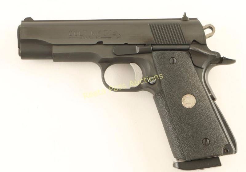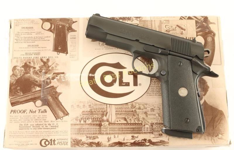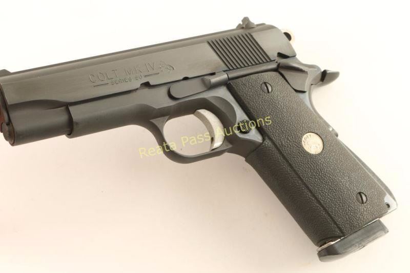 'MK IV Series 80' 1911-A1 Style single-action semi automatic pistol chambered in 45 Automatic, circa 1980's. Features a blued finish, 4.25" barrel, rear slide serrations, three dot sights, skeletonized hammer, serrated adjustable trigger, thumb safety, beavertail grip safety, serrated mainspring housing, push button magazine release, 8 round Gunsite marked magazine, and Colt medallion one-piece textured black rubber wrap-around grips. Includes the original factory hard case, sleeve and documents. Pistol exhibits approximately 99% of it's original blued finish with only some slight edge wear on the slide's top rib observed. Action is crisp, bore is excellent and grips are fine. Condition is near new in box. ***Modern Firearm***
