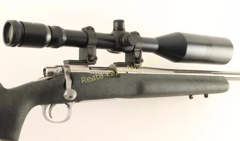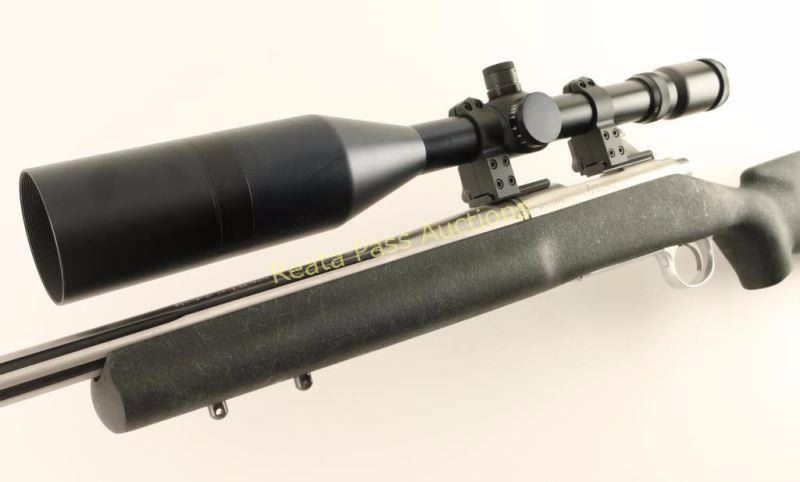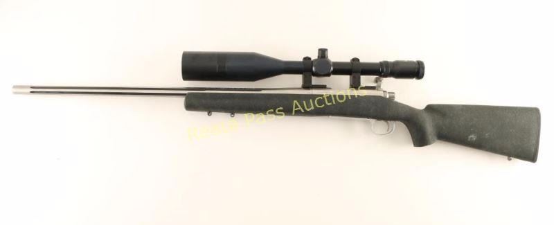 Stainless steel bolt action target rifle chambered in .204 Ruger. Features a brushed finish, heavy 26" fluted barrel with no provisions for sights, Tasco 8-30x scope on raised rings, manual safety, smooth adjustable trigger, integral box magazine with hinged floorplate, jeweled bolt with checkered knob, three swivel studs and black & green textured fiberglass pistol grip shoulder stock with semi-beavertail forend, large palm swell & factory recoil pad. Rifle exhibits a few light handling marks with no major wear observed. Action is very smooth, bore is pristine, optics are clear and stock is near fine. Condition is near excellent. ***Modern Firearm***