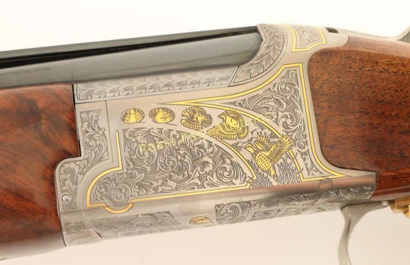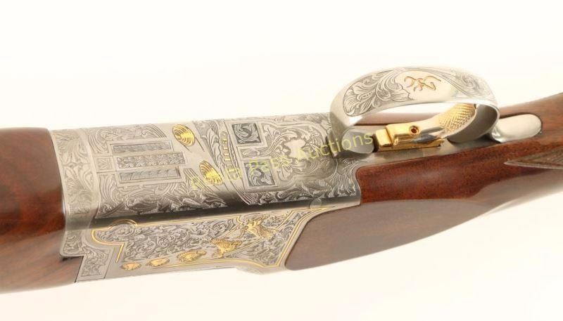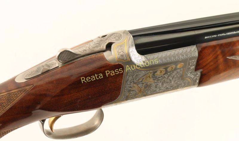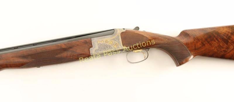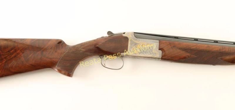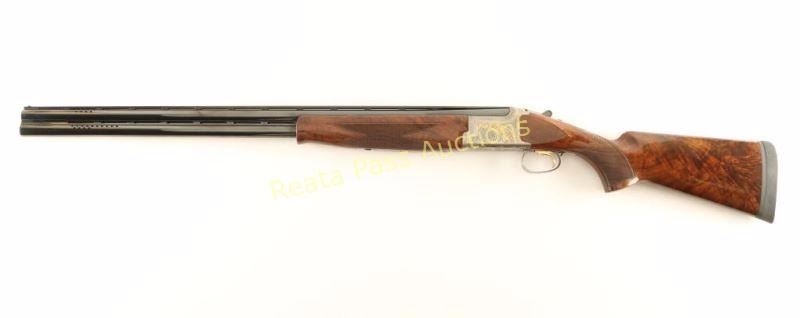 SN: 24453NTD13 Highly embellished Japanese made under/over double barrel shotgun chambered for 2 3/4" 12 gauge shells, circa 1996. Features high polish blued 30" ported barrels with wide ventilation ribs & removable skeet/skeet Invector Plus chokes, automatic ejectors, white bead sights, single gold adjustable trigger, sliding tang safety/barrel selector, full coverage floral scroll engraved receiver with gold inlaid line borders, game bird metamorphosing into a clay pigeon scenes on the sides & two clay pigeons on the underside, finely checkered fancy walnut Schnabel forend and pistol grip shoulder stock with Kick-Eez recoil pad. Includes the original factory box with manual. Shotgun exhibits approximately 99% of it's original finish with only some light wear on the gold trigger observed. Action is smooth, bores are pristine and wood stocks are near fine with a few minor blemished observed. Condition is near new in box. ***Modern Firearm***