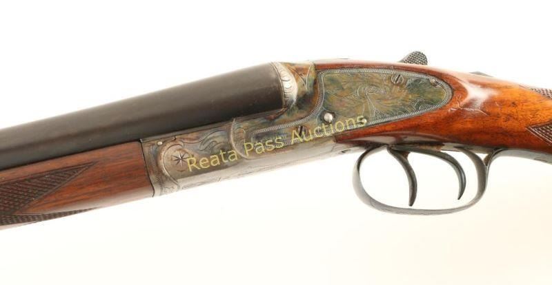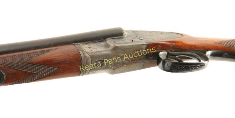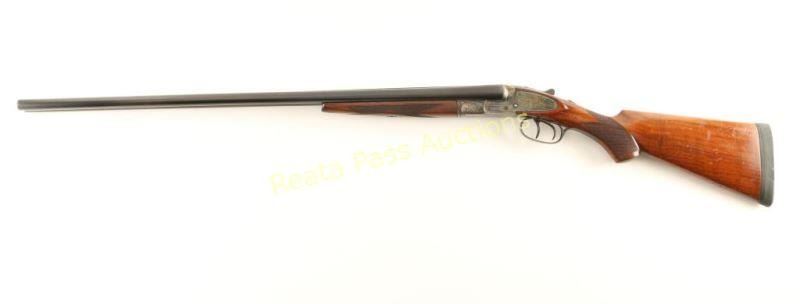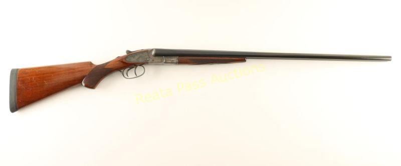 Engraved early American side-by-side sidelock shotgun chambered for 20 gauge shells, circa 1920. Features a blued/case hardened finish, 28" London Steel barrels with raised matted concave rib, brass bead front sight, automatic ejectors, case hardened frame with light coverage floral engraving, double triggers, checkered top lever, sliding tang safety, fancy checkered walnut splinter forend with ebony inlaid tip, and pistol grip shoulder stock with brown grip cap, Decelerator recoil pad & 14.5" LOP. Shotgun exhibits vibrant case colors with dulling on the underside of the receiver from carrying and retains approximately 90% of it's blued finish on the barrels showing light muzzle wear & light even thinning on the rear of the barrel along the receiver/forend. Action is sound, bores are excellent and wood stocks are very good+ with small blemishes a a 1/4" crack on the right side if the wrist extending from the receiver. Condition is near excellent. ***C&R Firearm*** ***Modern Firearm***