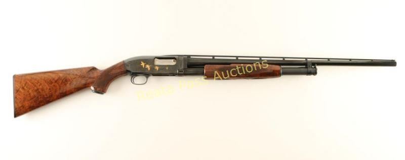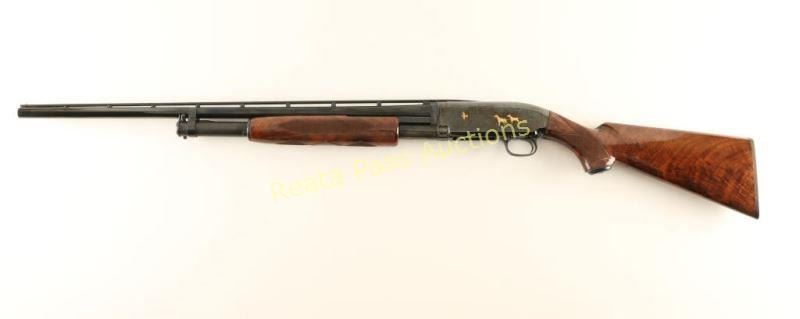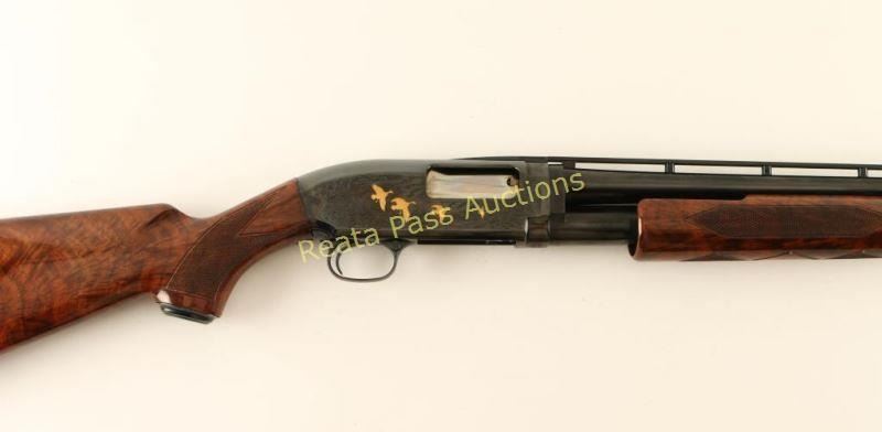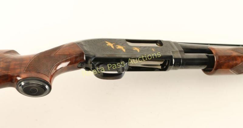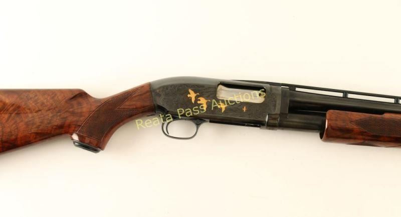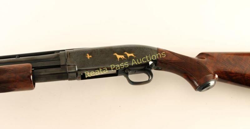 SN: 03146NM972 Highly embellished Japanese made slide action repeating shotgun chambered for 2 3/4" 28 gauge shells, circa 1990. Features a bright blued finish, 26" take-down barrel with raised ventilation rib & modified choke, silver bead front sight, plugged magazine tube, extensively engraved receiver with gold adorned game scenes, smooth trigger, push button safety, polished bolt, fancy checkered high gloss deluxe walnut slide handle and pistol grip shoulder stock with metal grip cap & factory black hard plastic buttplate. Includes the original factory box with manual. Shotgun exhibits little to no visible wear. Action is smooth, bore is pristine and wood stocks are extra fine. Condition is like new in box. ***Modern Firearm***