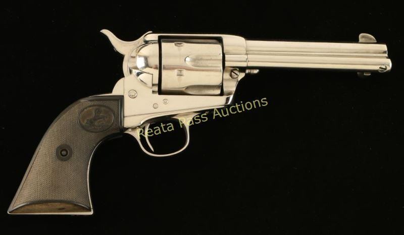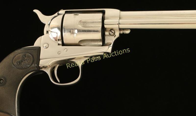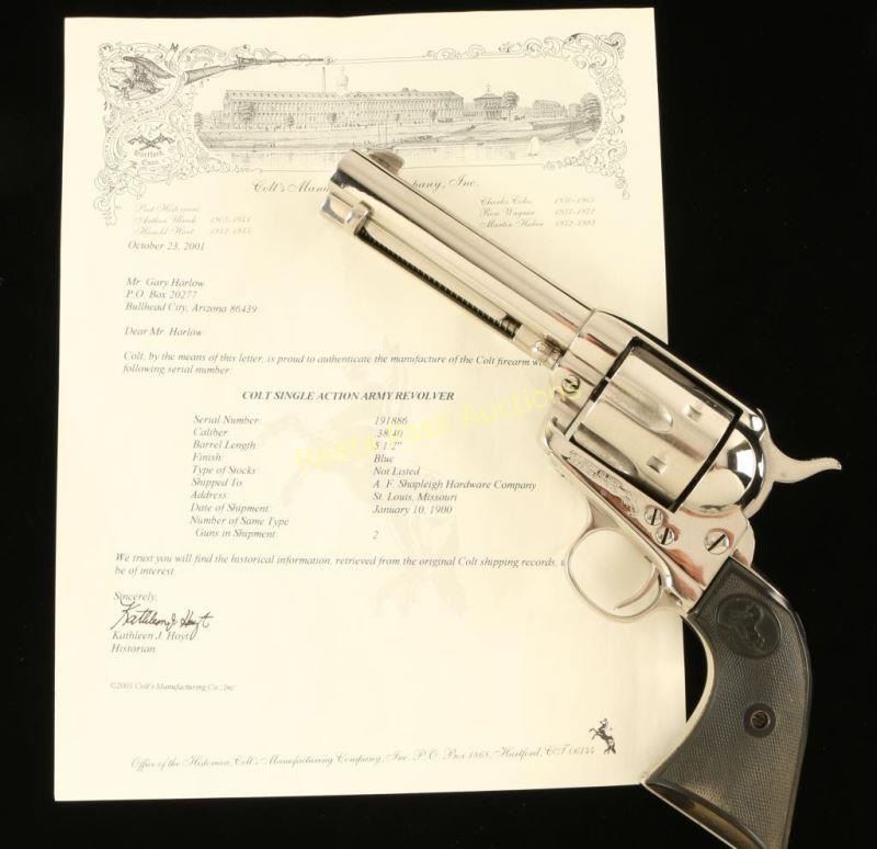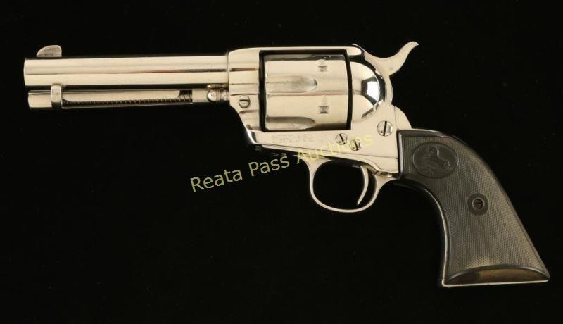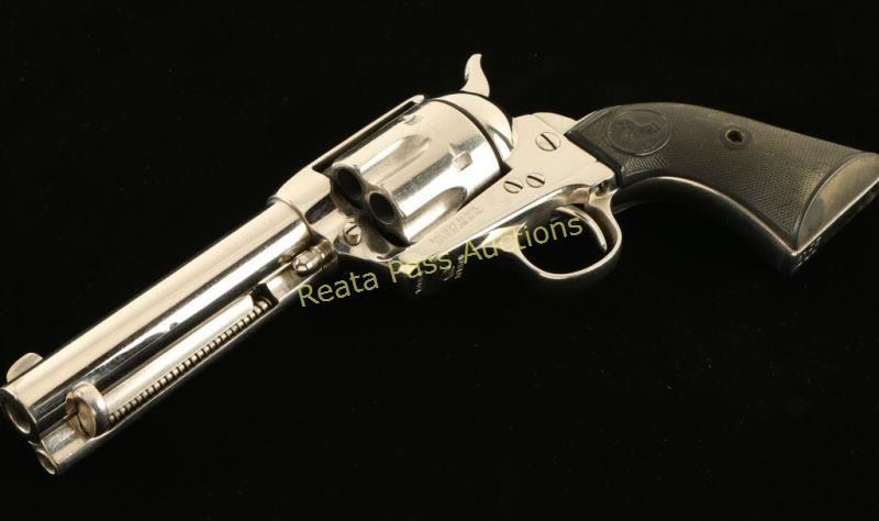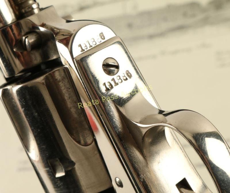 'First Generation' Refinished single action six-shot revolver chambered in .38-40 Winchester, circa 1899. Features a nickel plated refinish, 4 3/4" barrel with single line address, ejector rod, blade front sight, 'v' notched rear sight, checkered hammer spur, fluted cylinder, and Rampant Colt two-piece checkered black hard rubber grips(likely reproduction). Includes a Colt factory letter describing the original configuration as blued with a 5 ½” barrel and stating it was shipped to A. F. Shapleigh Hardware Company in St. Louis Missouri on January 10, 1900 in a two gun shipment. Markings are mostly good and all of the serial numbers match, each with the last digit “6” looking to be an over stamped “1”. The revolver retain nearly all of it’s nickel plated refinish showing handling wear, a drag line and light scattered oxidation. The backstrap has three distinct notches cut into it. Action is crisp with 3 clicks & good lock-up, bore is good with light rifling & some scattered light pitting and hard rubber grips are fine. Condition is good as refinished. ***C&R Firearm*** ***Modern Firearm***