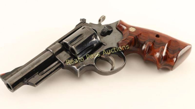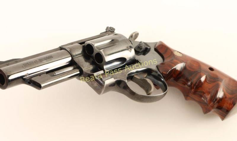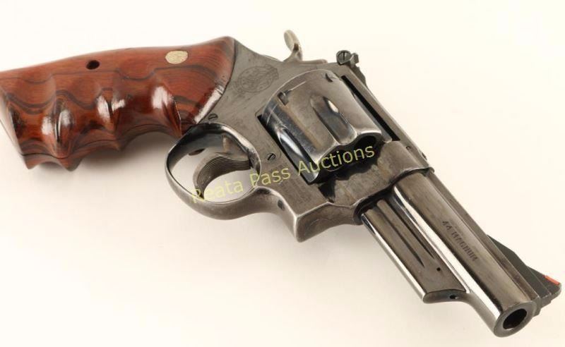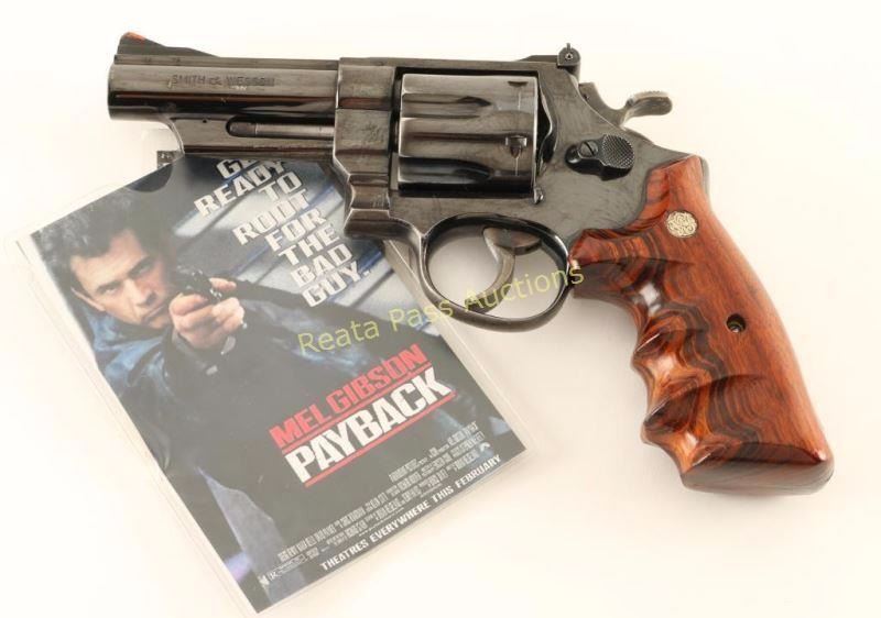 SN: N61427 This revolver was sold in The Stembridge Armory Auction at Little John's Auction Service in 2007 with a description that read "Smith & Wesson Model 29-2 DA revolver, .44 mag. cal., 4” barrel, #N61427. Revolver remains in overall good+ condition showing approx. 95% blue finish remaining with scattered nicks and mars from carry and use, adjustable white outline rear sight and red insert front ramp slight, crisp action, sharp markings, target hammer and trigger, bore and cylinders should clean to good, grips appear to be customized factory S&W medallion walnut finger grooved, possibly by Peter Orr (similar gun attributed to same movie had such a tag notation). From the Stembridge Arms inventory with tag noting “Mel GibsonPay Back”. A big frame S&W attributed to an action film starring well-known actor/director Mel Gibson." Includes the original auction tag and a photo of the gun during it's use in the movie. The barrel is pinned, cylinder is recessed and the trigger & hammer are both .500" target-style. Condition rating today is about 83% with aforementioned flaws along with edge wear. Action is smooth with very good lock-up, bore is near excellent with some minor pitting and wood grips are very good with minimal blemishes. Condition is very good. ***Modern Firearm***