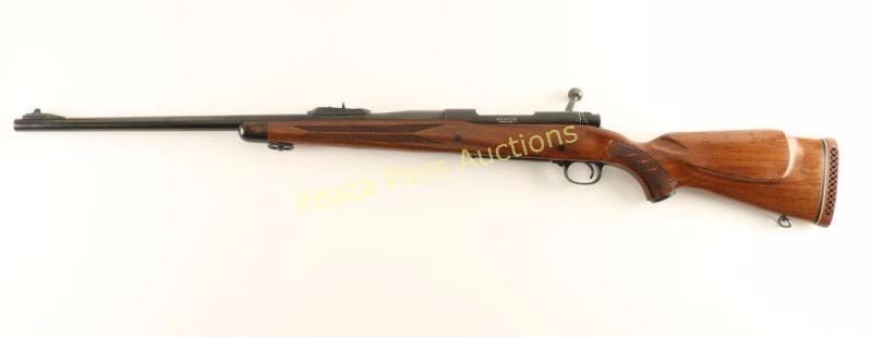 Vintage bolt action sporting rifle chambered in .375 Holland & Holland Magnum, circa 1965. Features a blued finish, 24" barrel, ramped blade front sight, adjustable rear express sight, drilled & tapped receiver, jeweled bolt, wide serrated trigger, integral box magazine with hinged floorplate, manual safety, sling swivels and press checkered Monte Carlo style walnut stock with painted black forend cap, metal grip cap & factory recoil pad. Rifle exhibits approximately 92% of it's original finish showing a couple spots of bright wear on the barrel & receiver, scattered light handling marks and a few small areas of emerging surface rusty on the barrel. Action is smooth, bore is excellent and wood stock is very good+ with minor blemishes & the black paint wearing off the forend. Condition is very good++. ***C&R Firearm*** ***Modern Firearm***